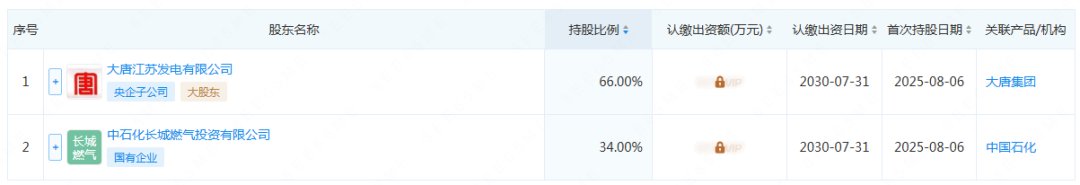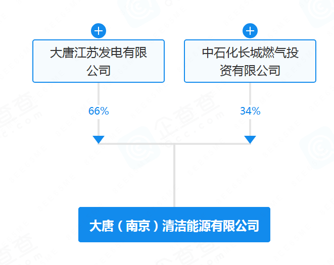 股权穿透图显示,该企业由大唐江苏发电有限公司和中石化长城燃气投资有限公司共同成立。其中,大唐江苏发电有限公司持股66.00%,中石化长城燃气投资有限公司持股34.00%。