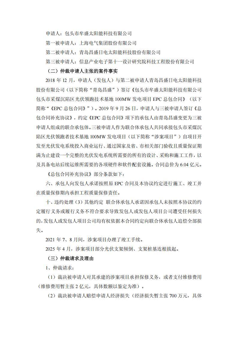 事件原由:2018 年 12 月,牟盛太阳能与第二被申请人青岛昌盛日电太阳能科技股份有限公司(以下简称“青岛昌盛”)签订《包头市牟盛太阳能科技有限公司包头市采煤沉陷区光伏领跑技术基地 100MW 发电项目 EPC 总包合同》。2019 年 9 月 26 日,牟盛太阳能与三被申请人签订《总包合同补充协议》,约定《EPC 总包合同》项下的承包人由青岛昌盛变更为三被申请人组成的联合承包体。三被申请人作为联合体承包人共同承接包头市采煤沉陷区光伏领跑者技术基地 100MW 发电项目自项目开发至光伏发电系统投入商业运行、通过国家及省、市相关部门验收且质量保证期满为止建设一个完整的光伏发电系统所需要的所有的设计、采购和施工工作,以及具备电站后续运维所需要的各项硬件和软件配套设施。合同总价为 6.04 亿元。