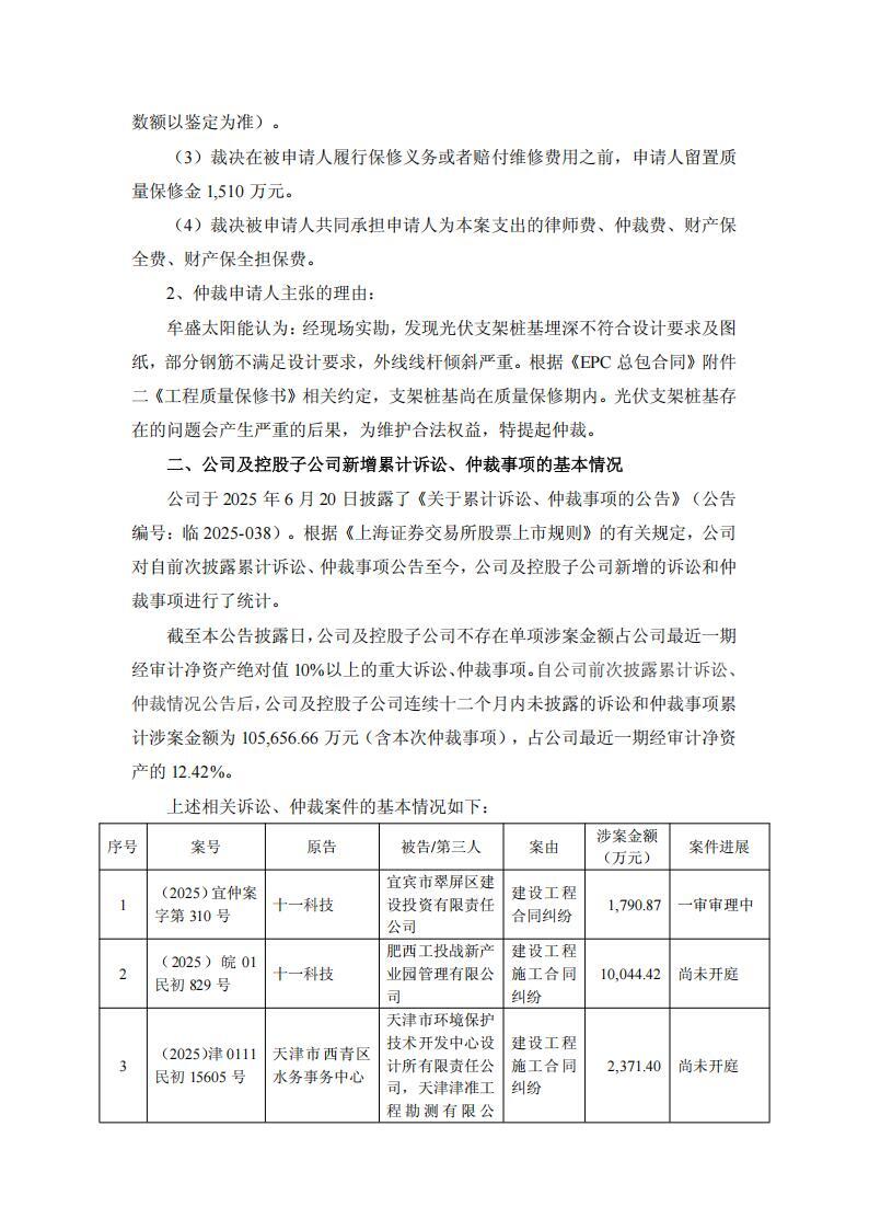 公告显示,太极实业子公司十一科技于近日收到上海国际经济贸易仲裁委员会(上海国际仲裁中心)仲裁通知【上国仲(2025)第 2666 号】。因建设工程合同纠纷,包头市牟盛太阳能科技有限公司向上海国际经济贸易仲裁委员会提起了以上海电气集团股份有限公司、青岛昌盛日电太阳能科技股份有限公司、十一科技三方为被申请人的仲裁申请。