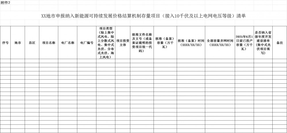 附件2.XX地市申报纳入新能源可持续发展价格结算机制存量项目(接入10千伏及以上电网电压等级)清单.xls