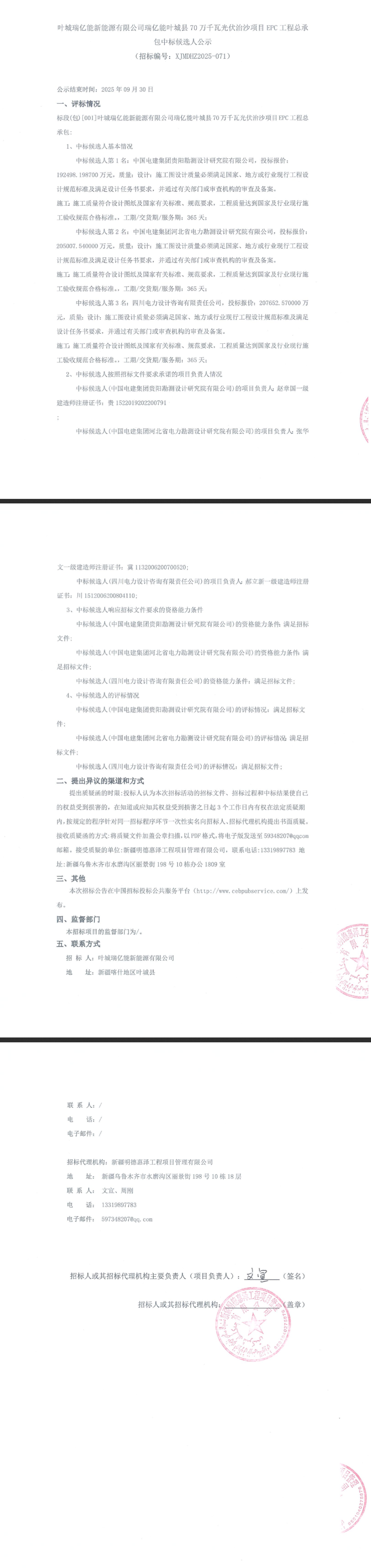 中国电建集团贵阳勘测设计研究院有限公司、中国电建集团河北省电力勘测设计研究院有限公司、四川电力设计咨询有限责任公司3家企业入围,投标单价2.75~2.97元/W。