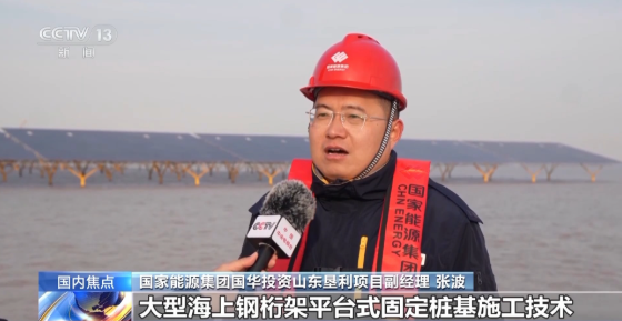 国家能源集团国华投资山东垦利项目副经理 张波:项目在全国创新应用大型海上钢桁架平台式固定桩基施工技术,采用四桩基础+光伏平台优化结构,平台倾角为精准调校的15度,不仅能抵抗11级强风和冬季冰情,还能节约项目用钢量超10%,为同类项目开发建设提供经验借鉴。