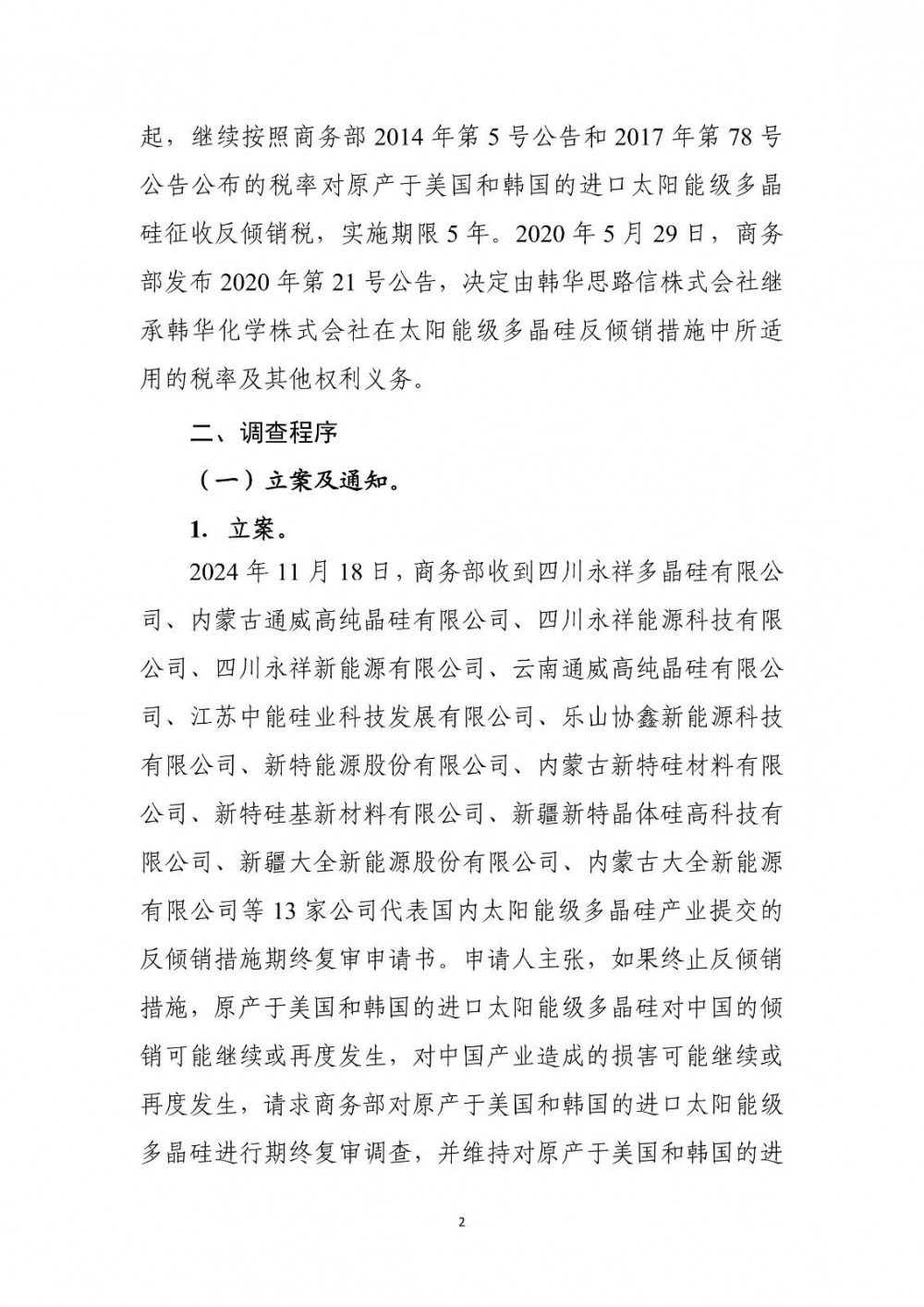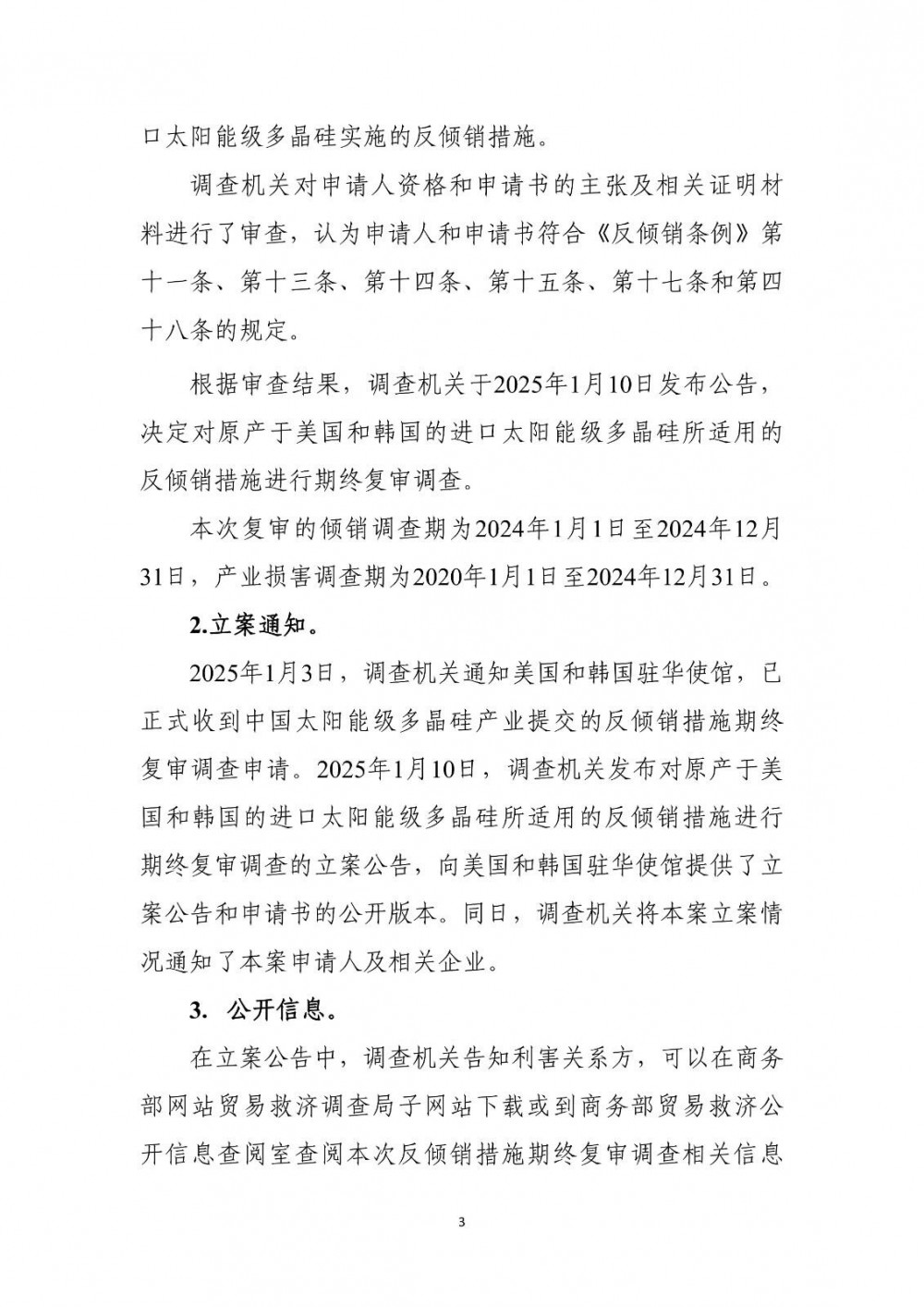2025年1月10日,应中国太阳能级多晶硅产业申请,商务部发布2025年第7号公告,决定自2025年1月14日起,对原产于美国和韩国的进口太阳能级多晶硅所适用的反倾销措施进行期终复审调查。