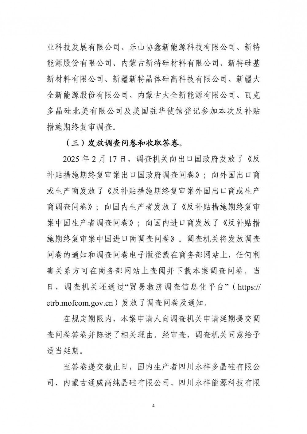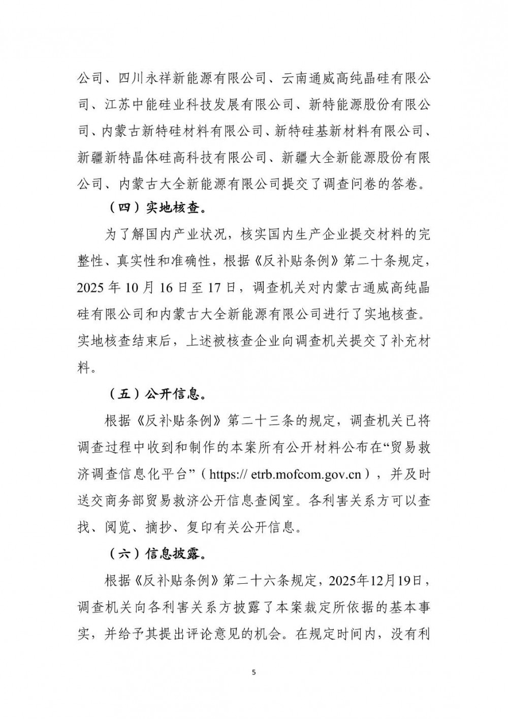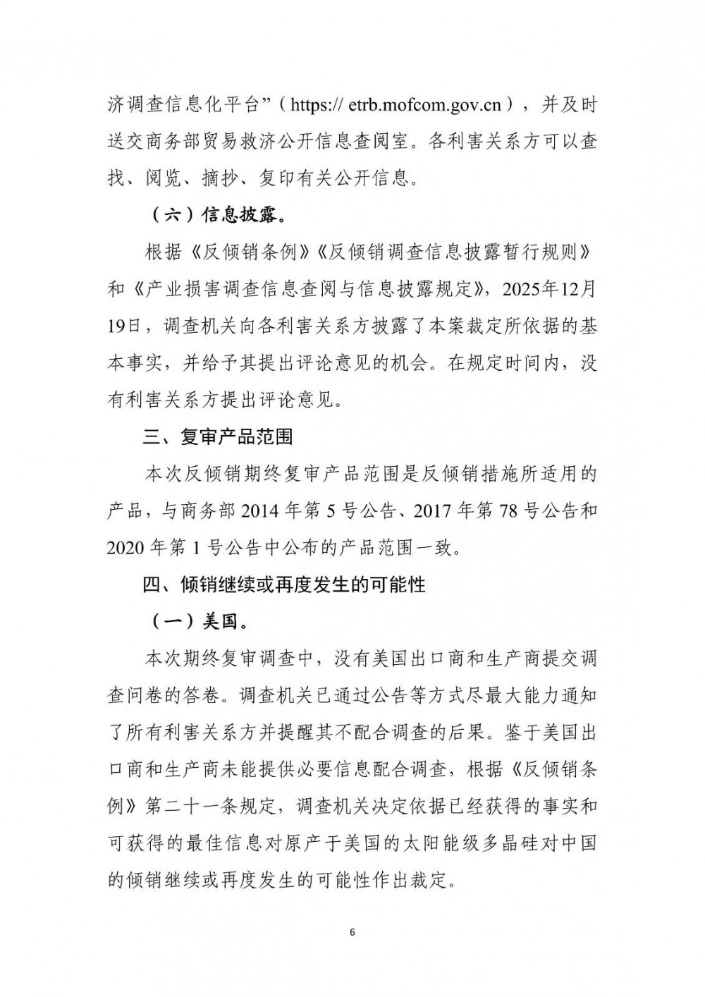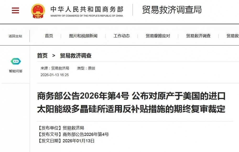 此外,1月13日,商务部发布2026年第4号公告,公布对原产于美国的进口太阳能级多晶硅所适用反补贴措施的期终复审裁定。