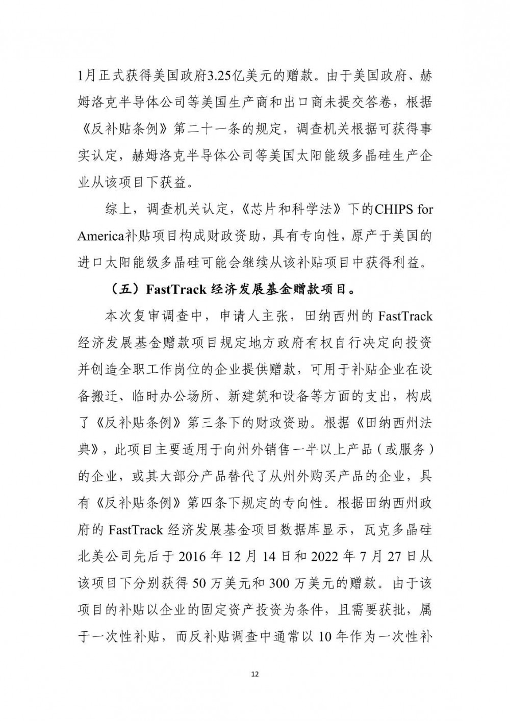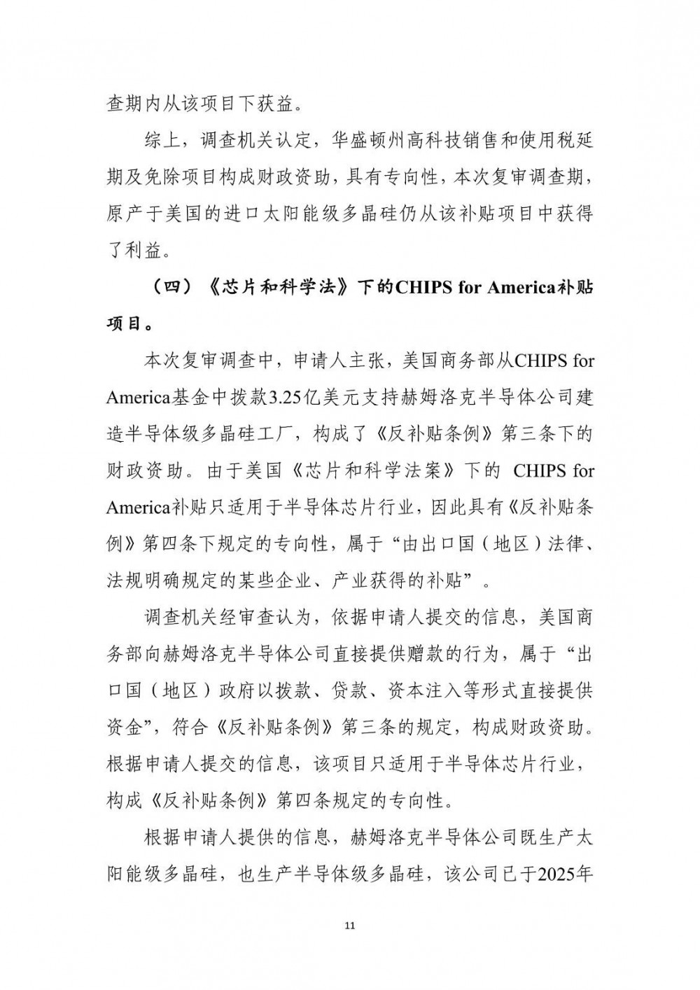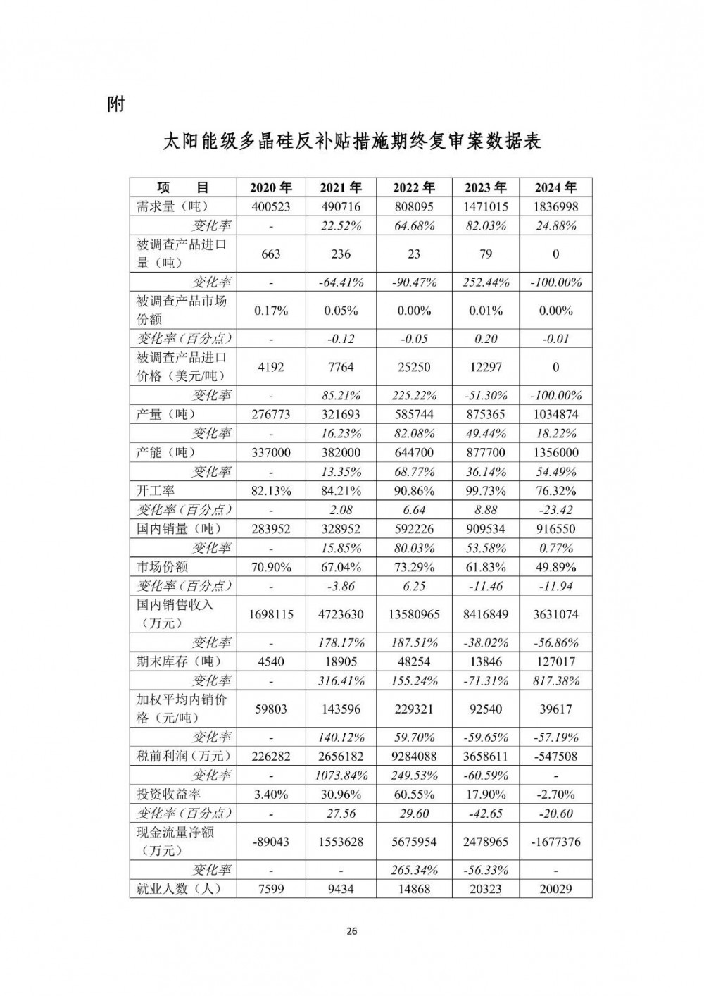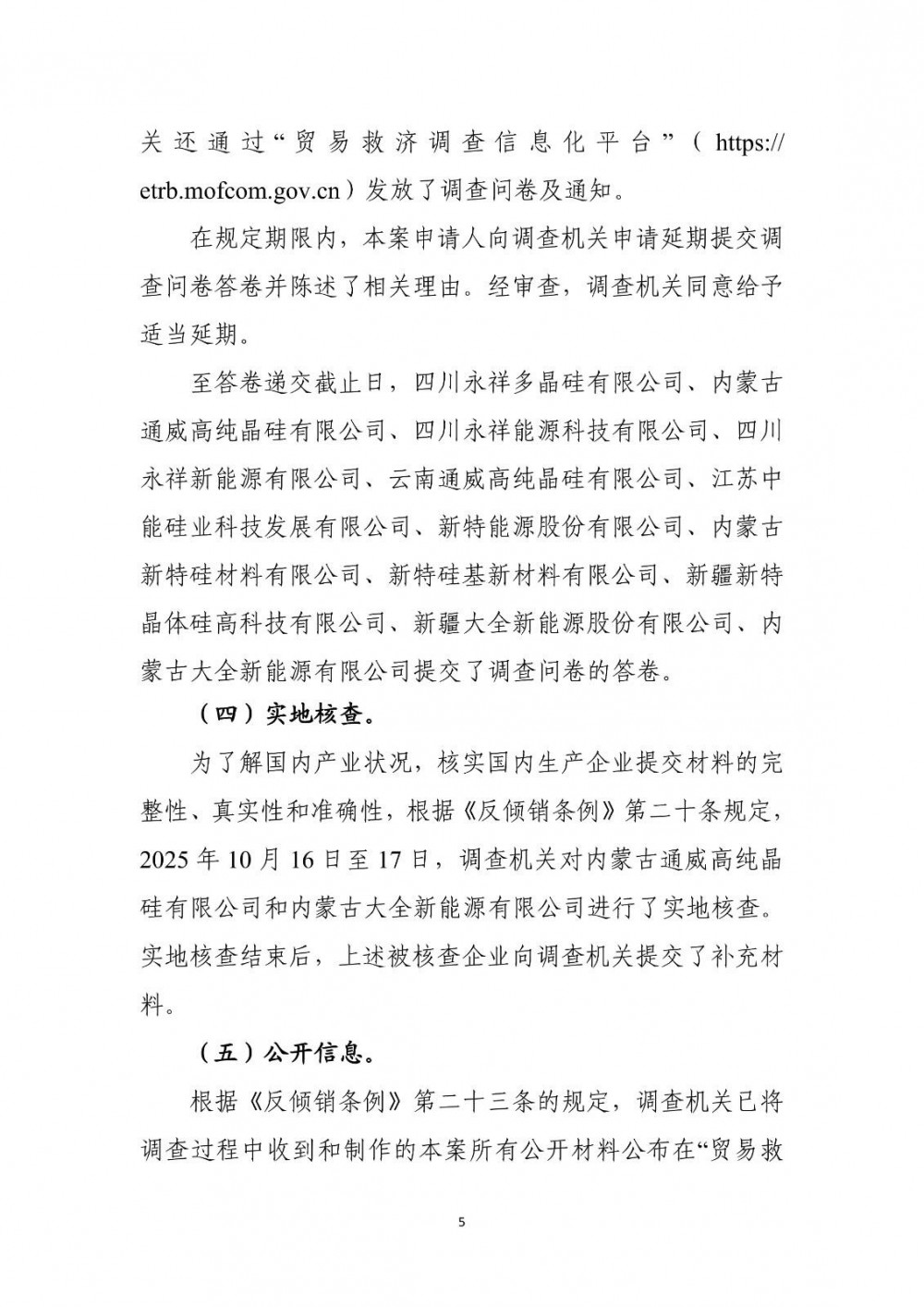 此外,1月13日,商务部发布2026年第4号公告,公布对原产于美国的进口太阳能级多晶硅所适用反补贴措施的期终复审裁定。