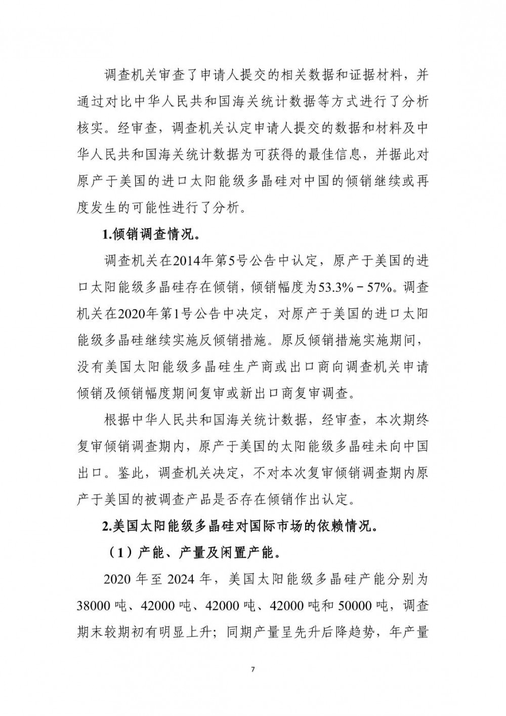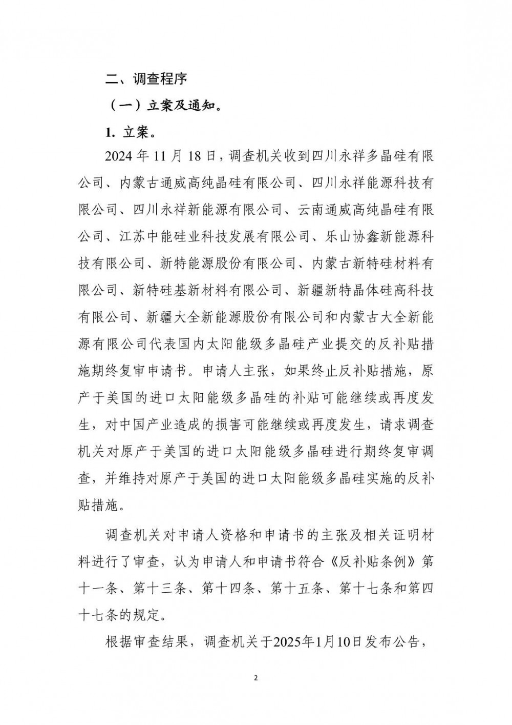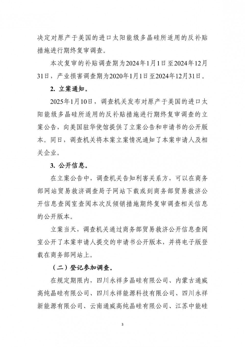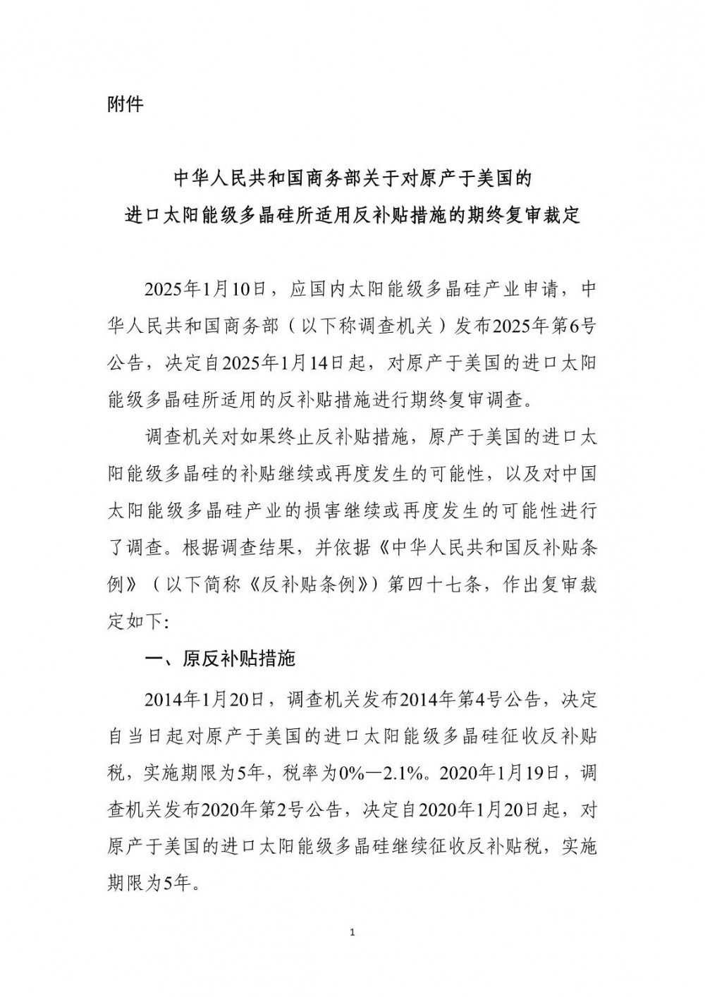 2025年1月10日,应中国太阳能级多晶硅产业申请,商务部发布2025年第6号公告,决定自2025年1月14日起对原产于美国的进口太阳能级多晶硅所适用的反补贴措施进行期终复审调查。