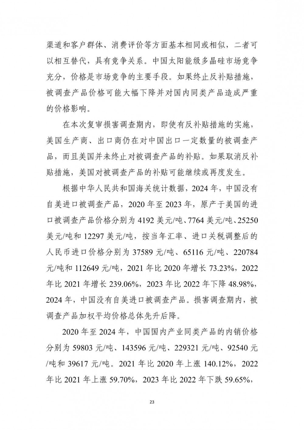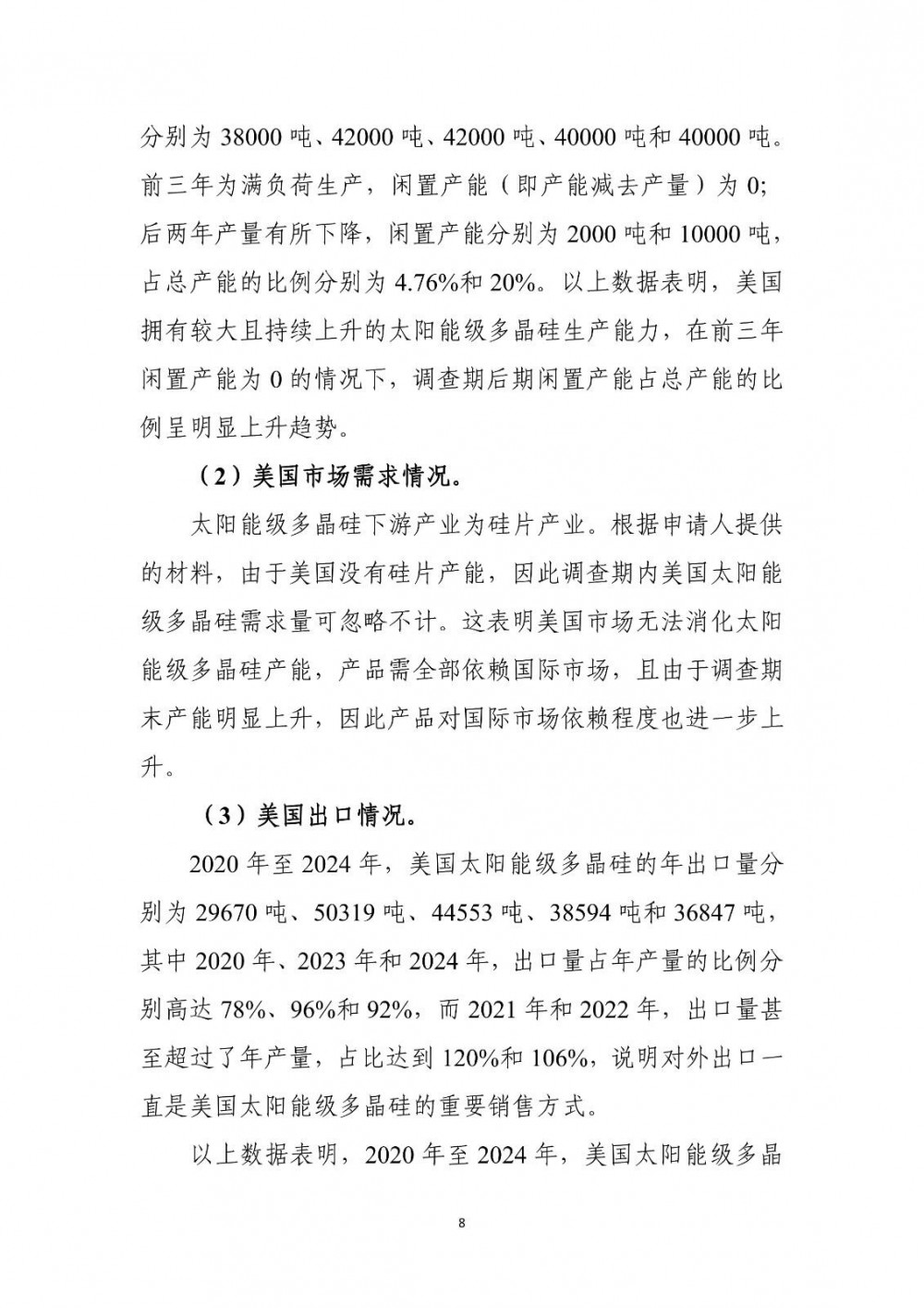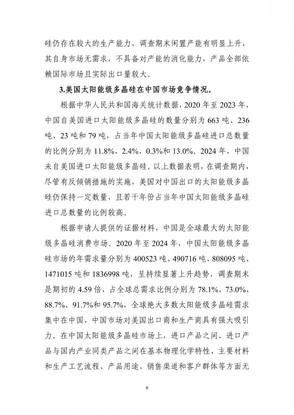 2025年1月10日,应中国太阳能级多晶硅产业申请,商务部发布2025年第6号公告,决定自2025年1月14日起对原产于美国的进口太阳能级多晶硅所适用的反补贴措施进行期终复审调查。