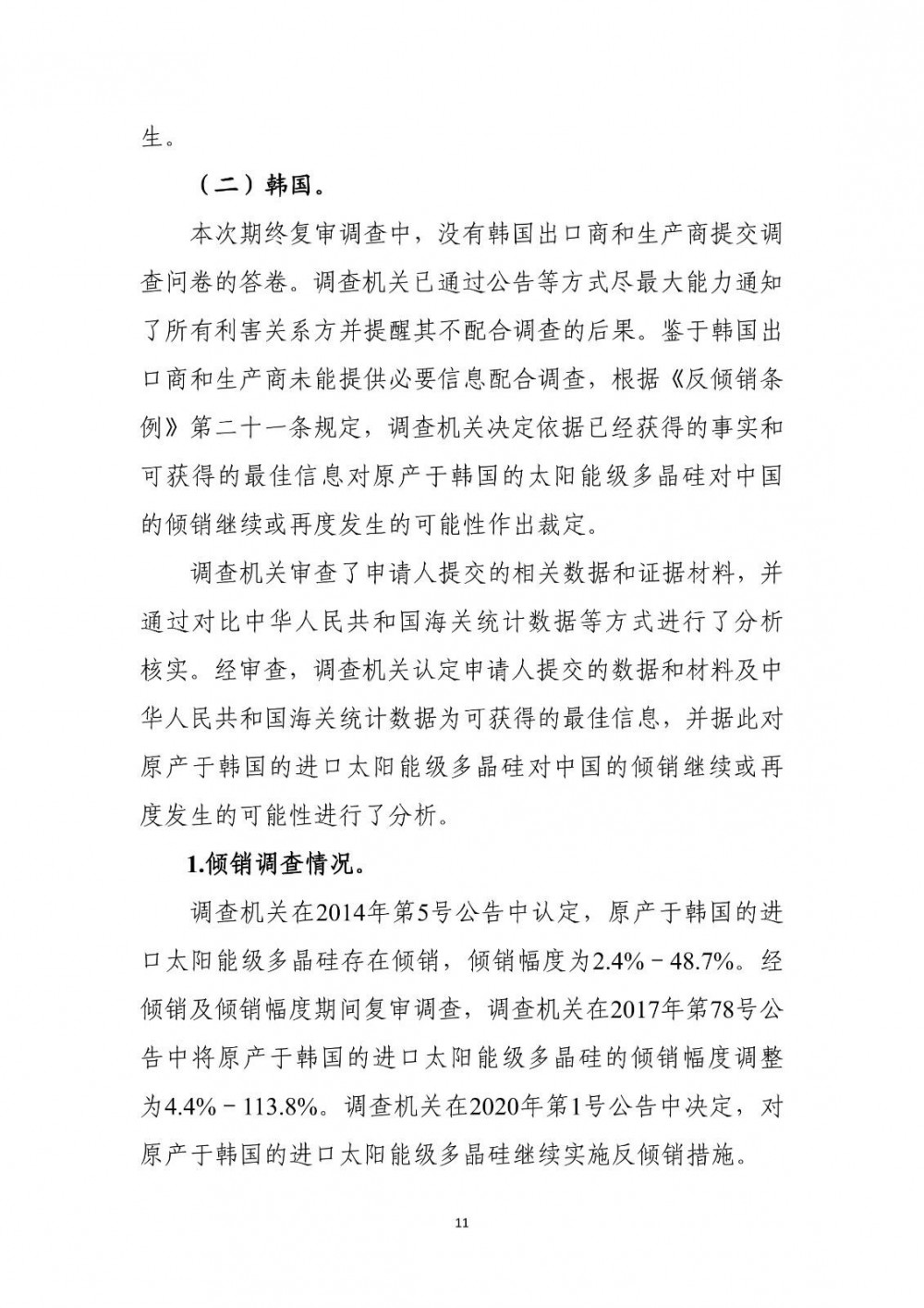 2014年1月20日,商务部发布2014年第5号公告,决定自当日起,对原产于美国和韩国的进口太阳能级多晶硅征收反倾销税,税率为美国公司53.3%-57%,韩国公司2.4%-48.7%,实施期限为5年。2017年11月21日,商务部发布2017年第78号公告,决定将原产于韩国的进口太阳能级多晶硅反倾销税率调整为4.4%-113.8%。2020年1月19日,商务部发布2020年第1号公告,决定自2020年1月20日起,继续按照商务部2014年第5号公告和2017年第78号公告公布的税率对原产于美国和韩国的进口太阳能级多晶硅征收反倾销税,实施期限5年。2020年5月29日,商务部发布2020年第21号公告,决定由韩华思路信株式会社继承韩华化学株式会社在太阳能级多晶硅反倾销措施中所适用的税率及其他权利义务。