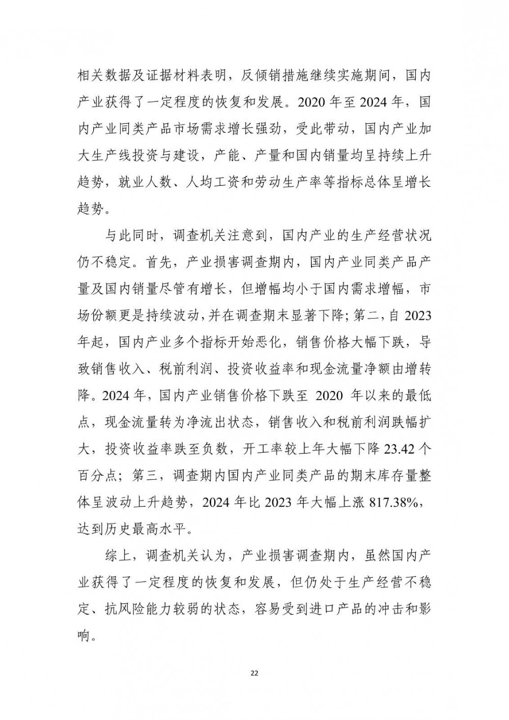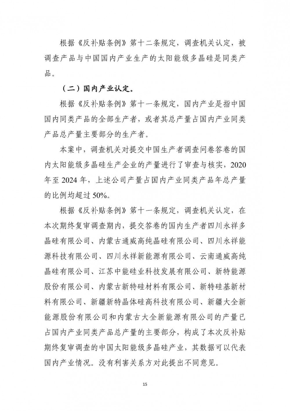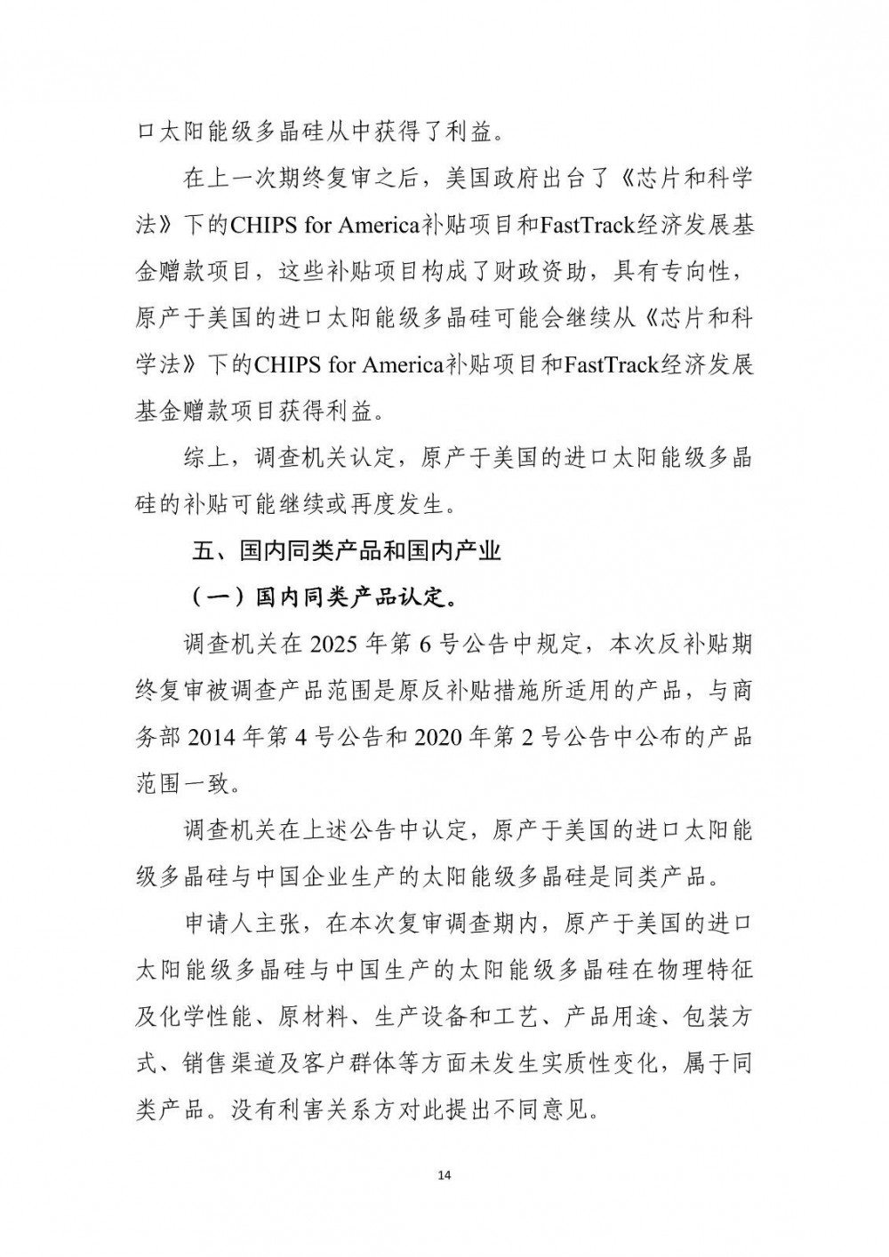 根据《反补贴条例》第四十九条的规定,商务部根据调查结果向国务院关税税则委员会提出继续实施反补贴措施的建议,国务院关税税则委员会根据商务部的建议作出决定,自2026年1月14日起,对原产于美国的进口太阳能级多晶硅继续征收反补贴税,实施期限为5年。