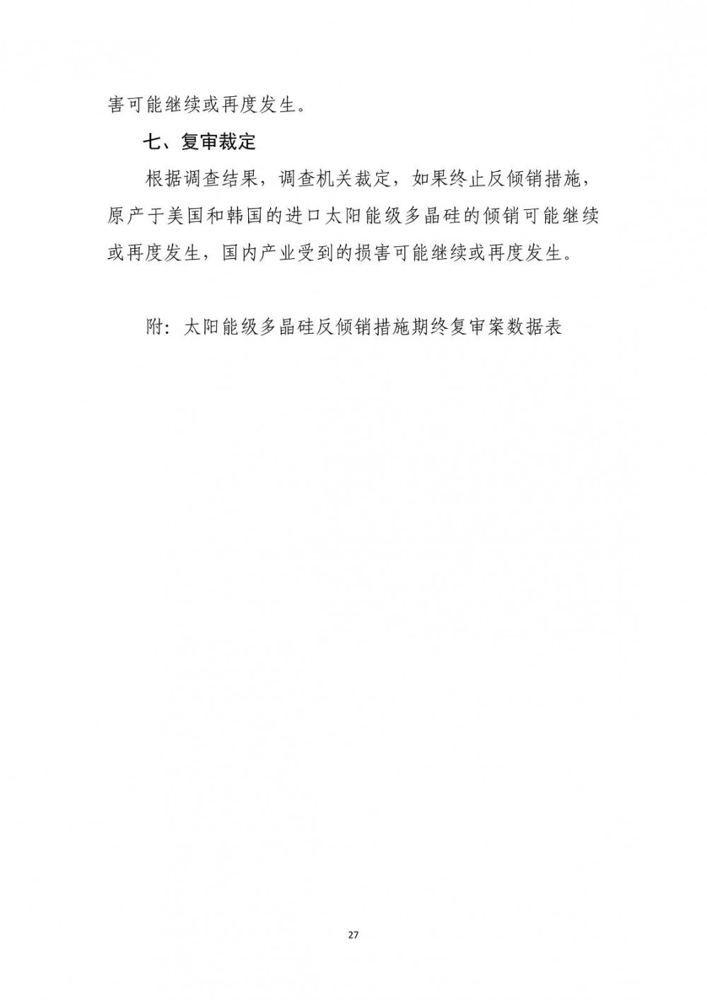 商务部裁定,如果终止反倾销措施,原产于美国和韩国的进口太阳能级多晶硅对中国的倾销可能继续或再度发生,对中国太阳能级多晶硅产业造成的损害可能继续或再度发生。