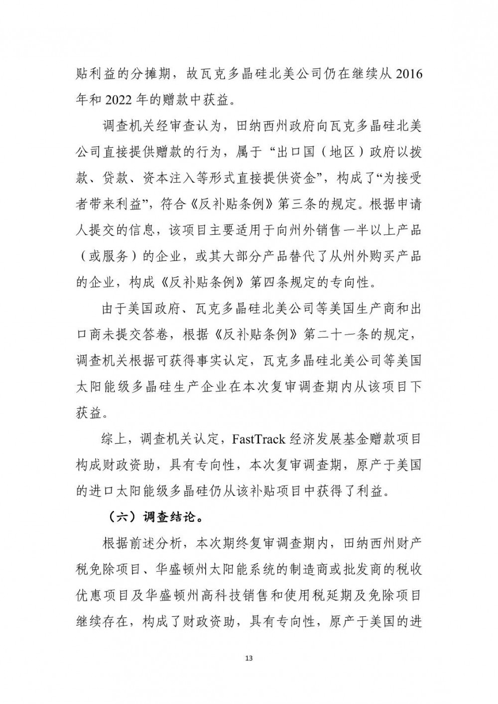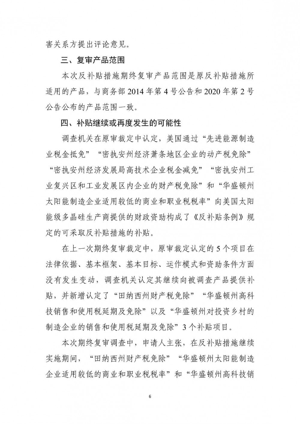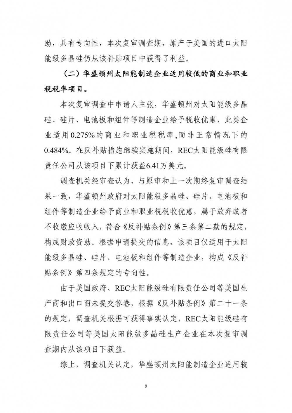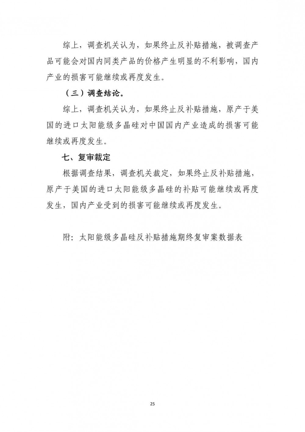 商务部裁定,如果终止反补贴措施,原产于美国的进口太阳能级多晶硅的补贴可能继续或再度发生,对中国太阳能级多晶硅产业造成的损害可能继续或再度发生。