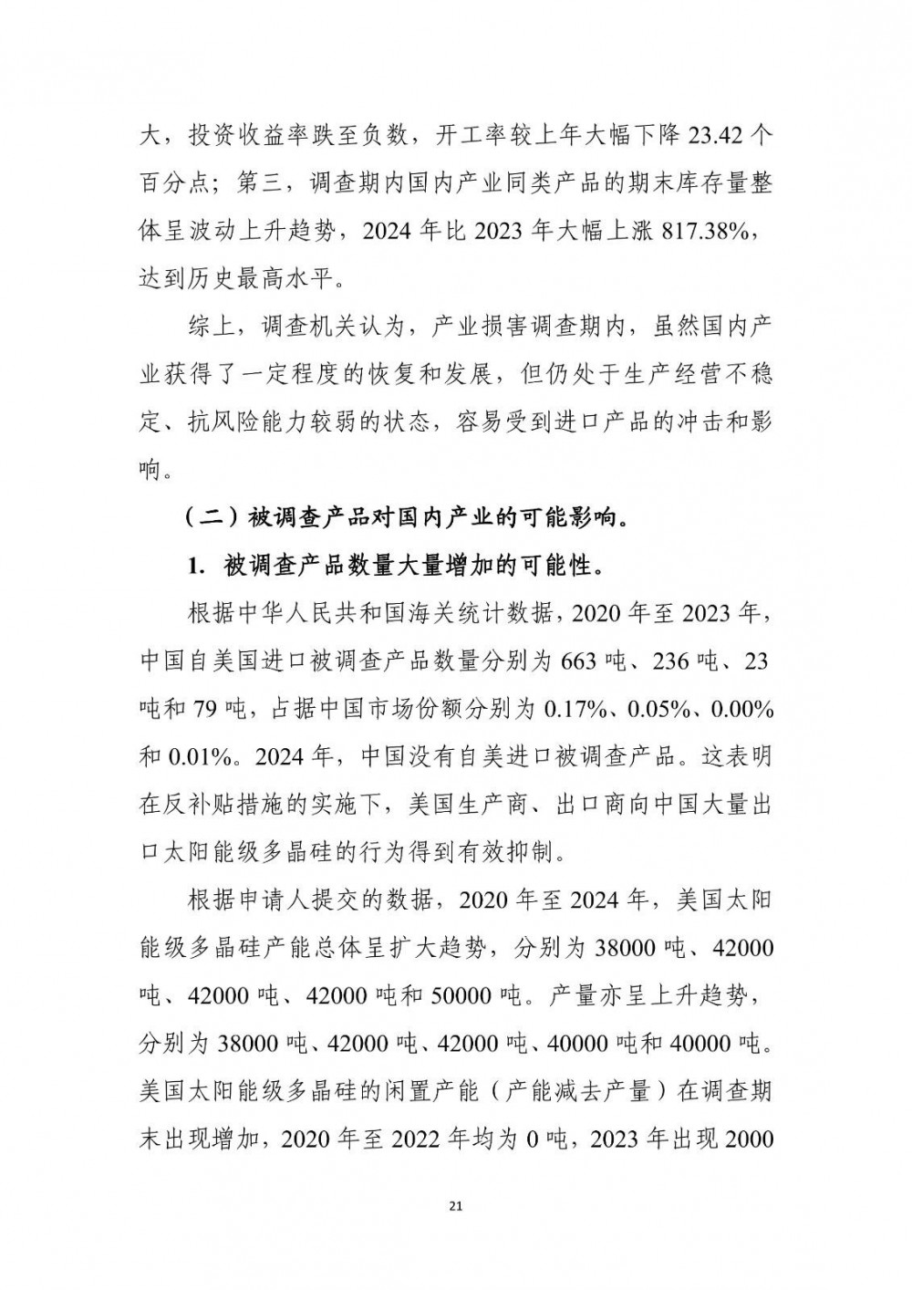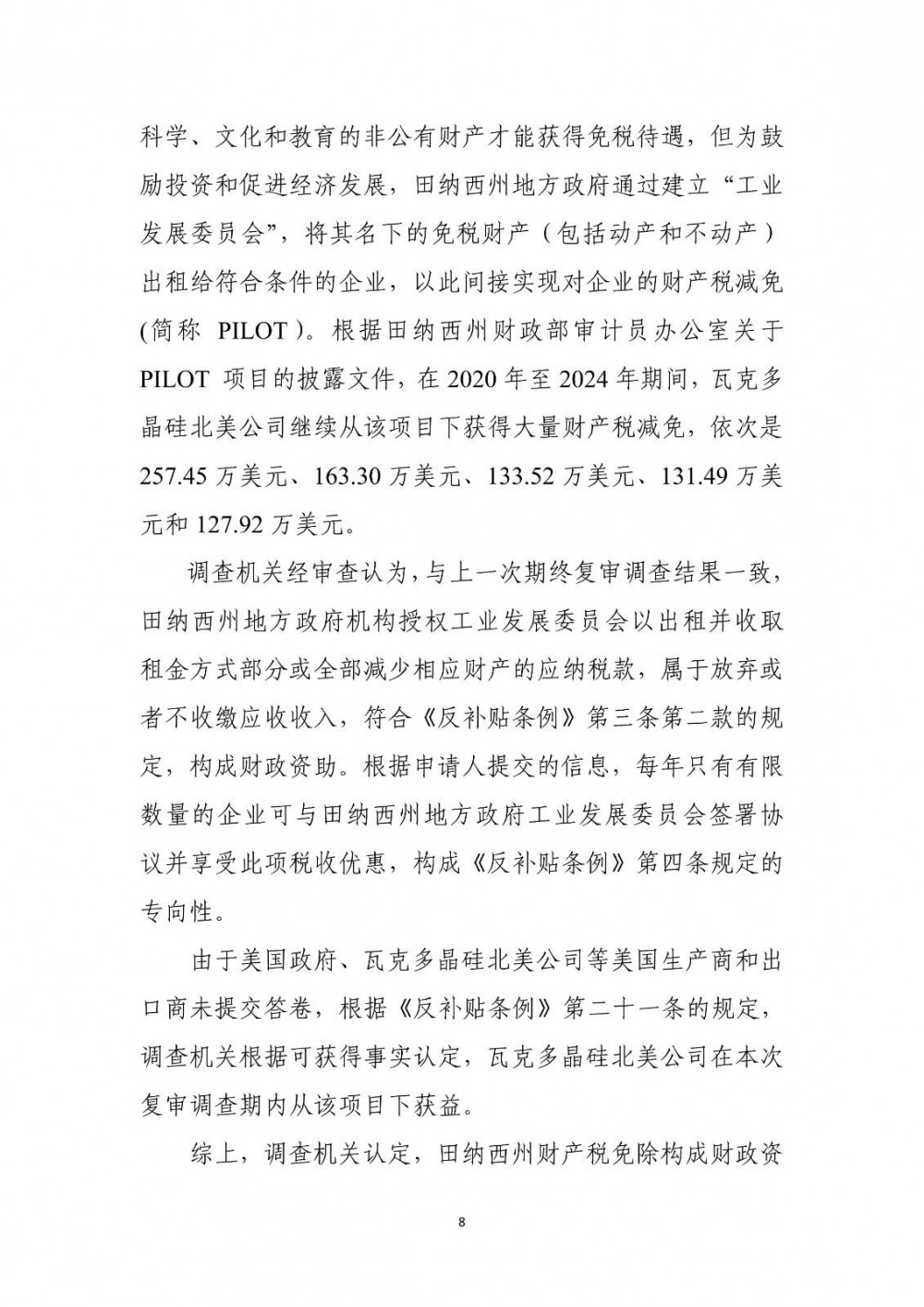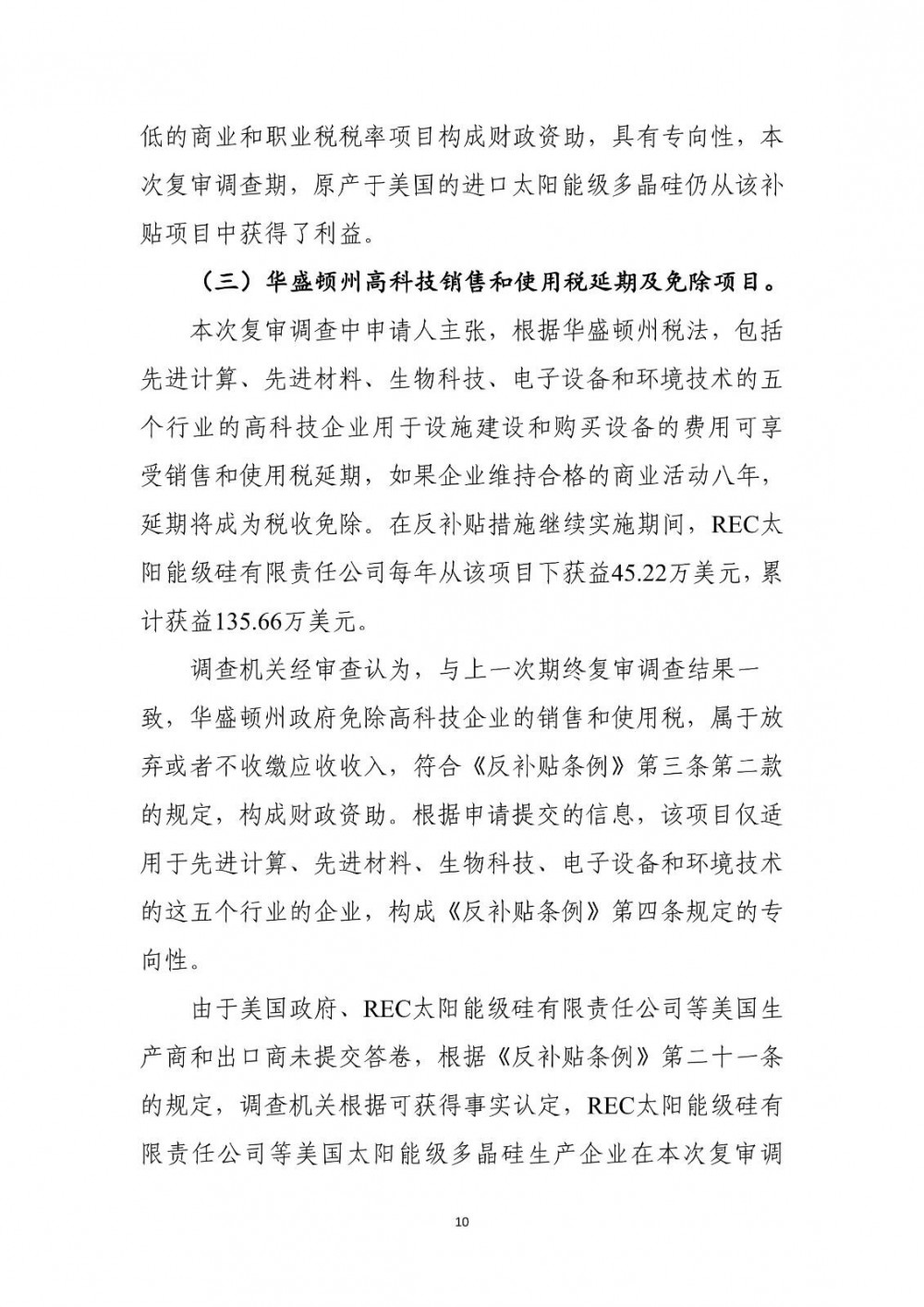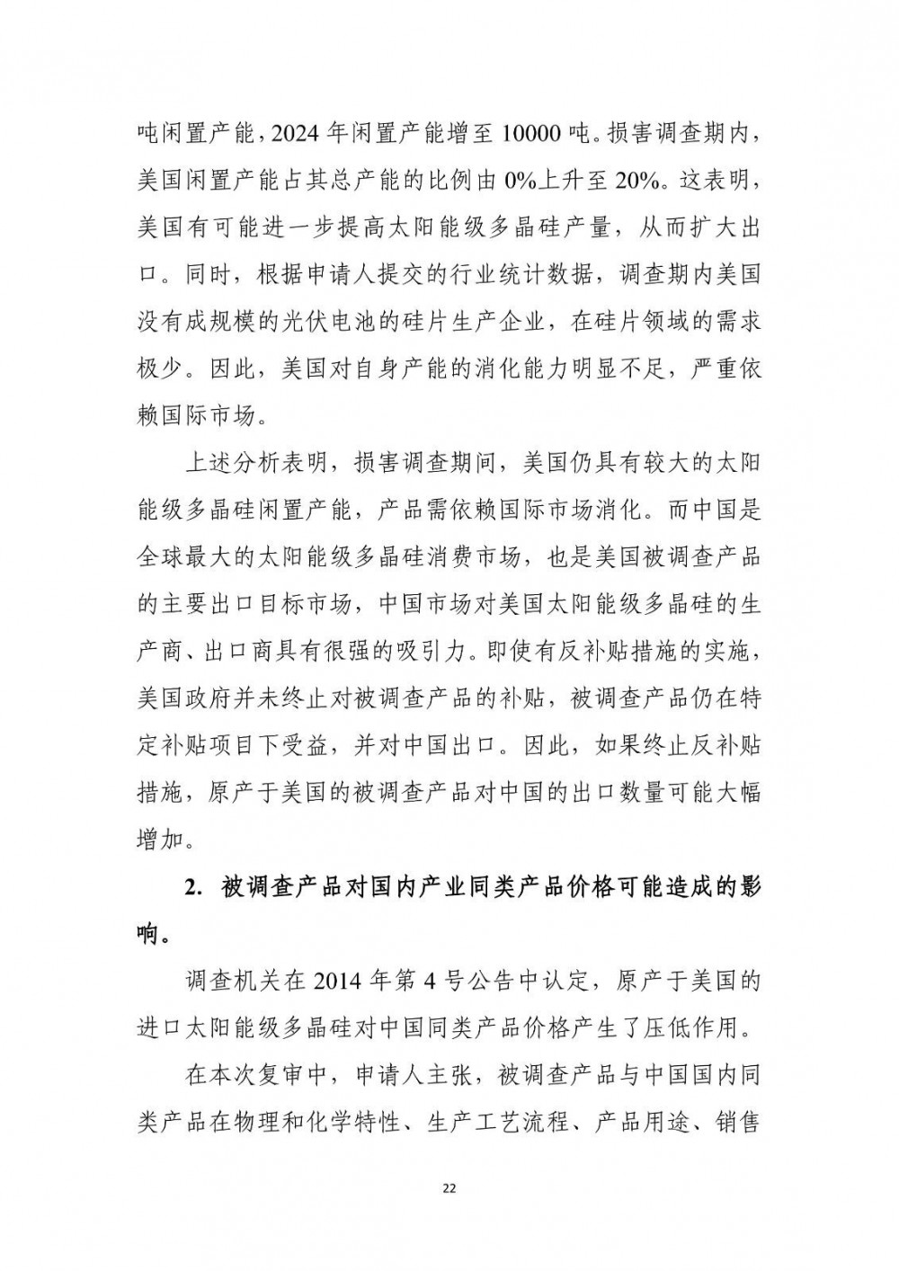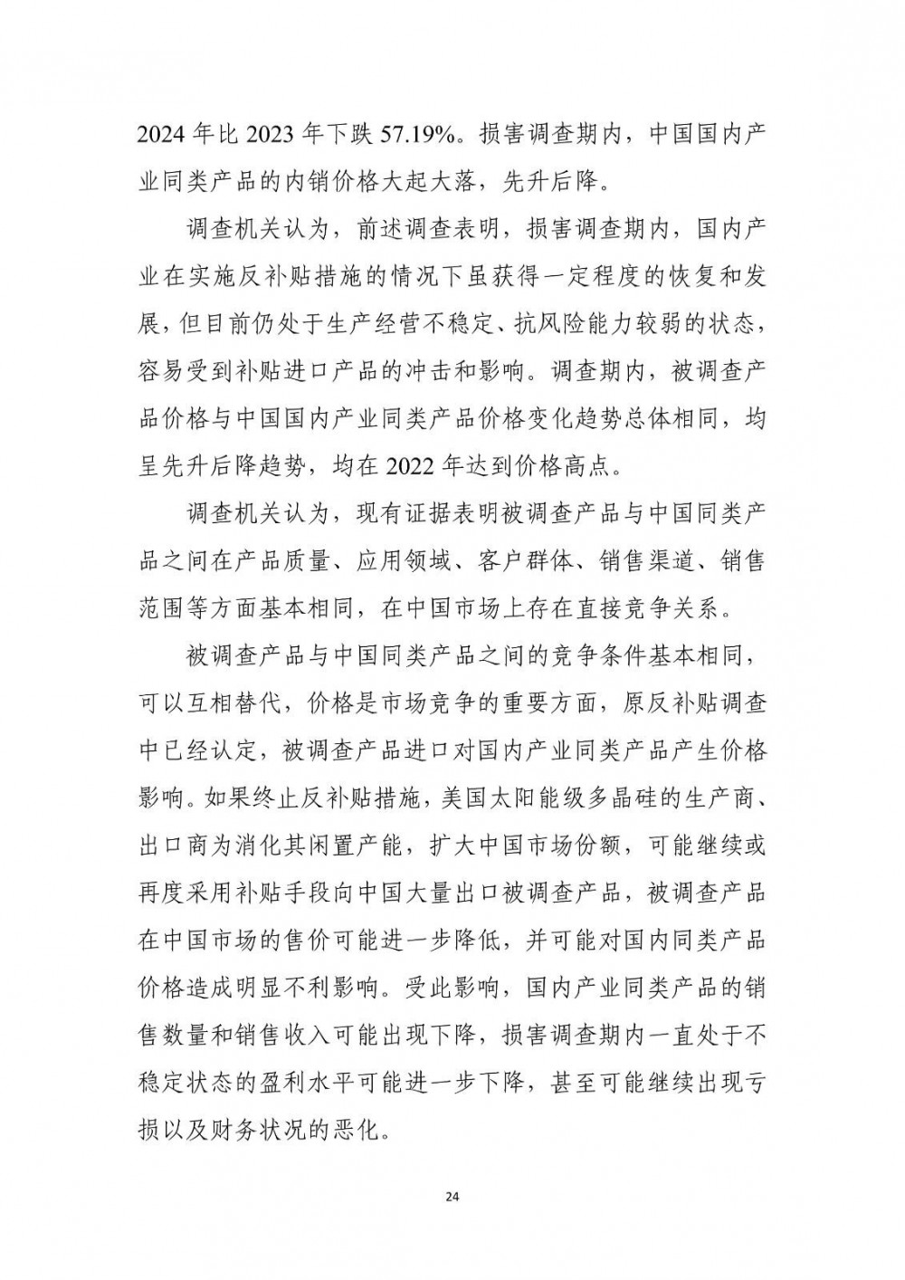 商务部裁定,如果终止反补贴措施,原产于美国的进口太阳能级多晶硅的补贴可能继续或再度发生,对中国太阳能级多晶硅产业造成的损害可能继续或再度发生。