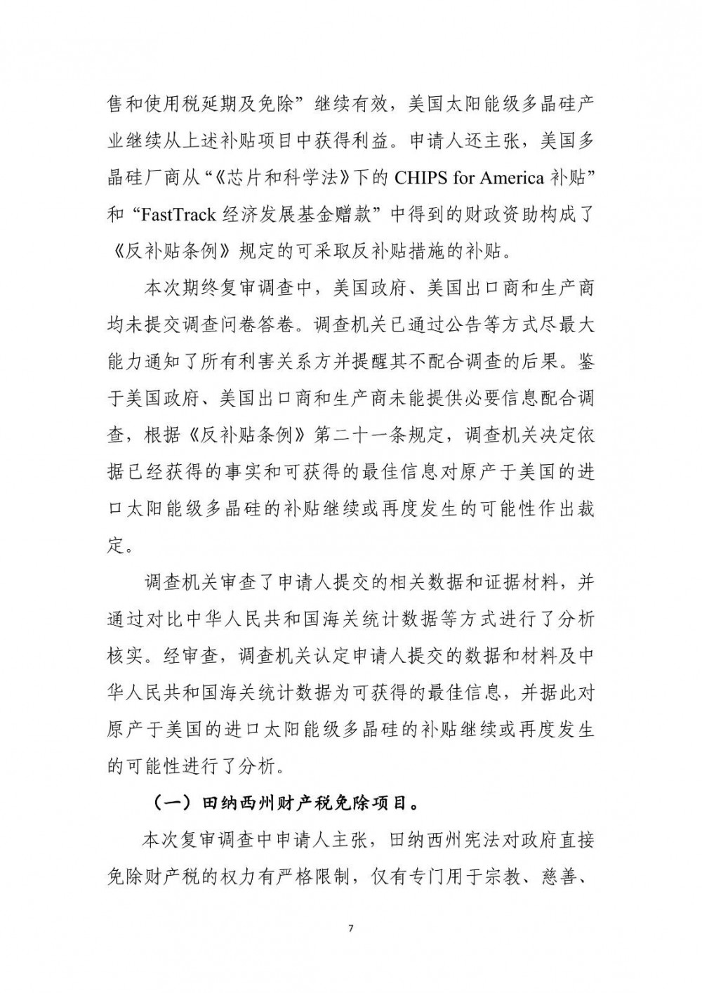 2014年1月20日,商务部发布2014年第4号公告,决定自当日起对原产于美国的进口太阳能级多晶硅征收反补贴税,实施期限为5年,美国各公司税率为0%—2.1%。2020年1月19日,商务部发布2020年第2号公告,决定自2020年1月20日起,继续按照商务部2014年第4号公告公布的税率对原产于美国的进口太阳能级多晶硅征收反补贴税,实施期限5年。