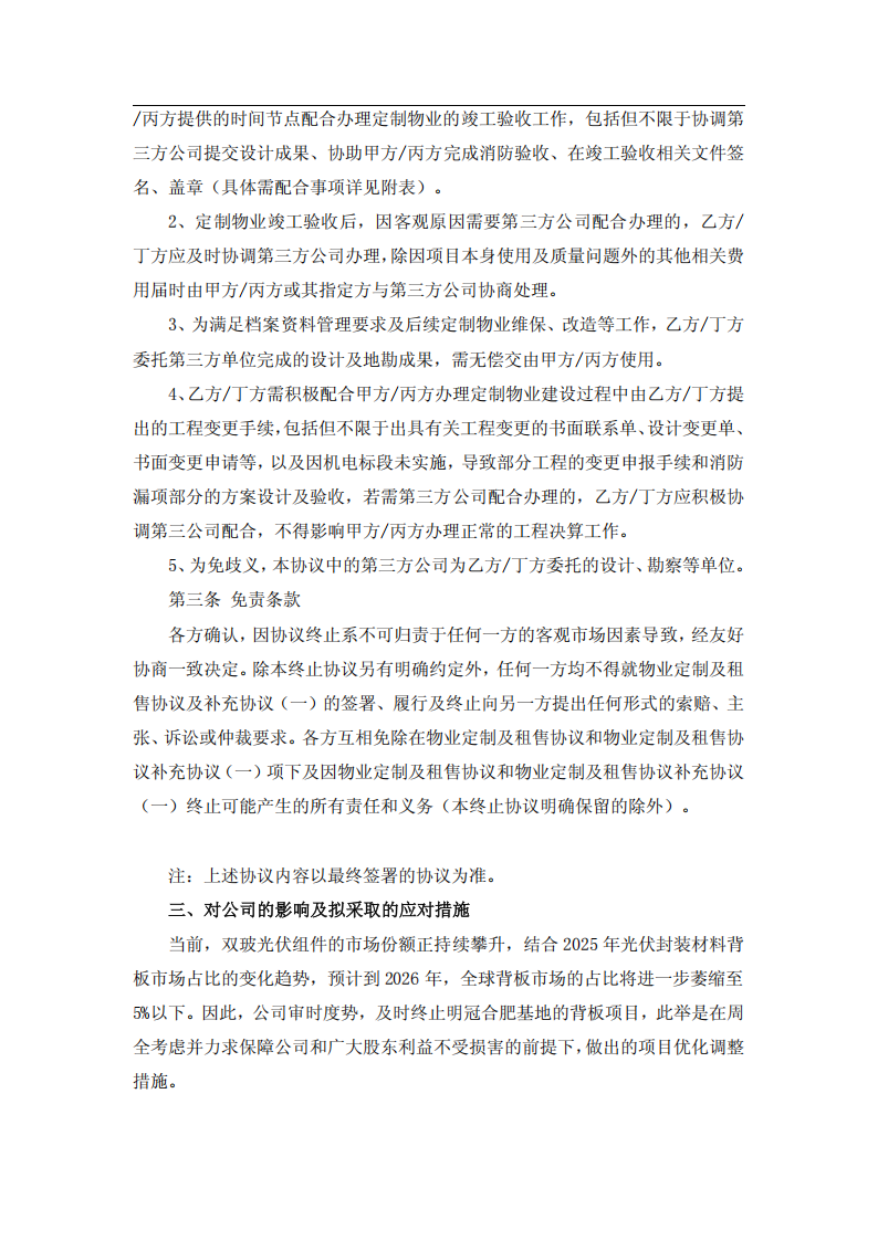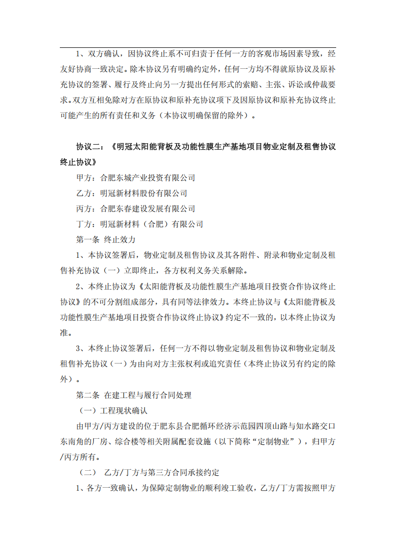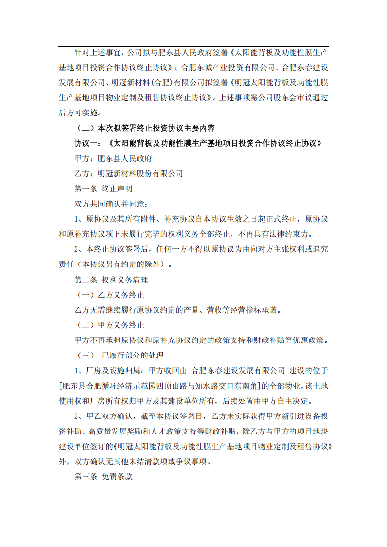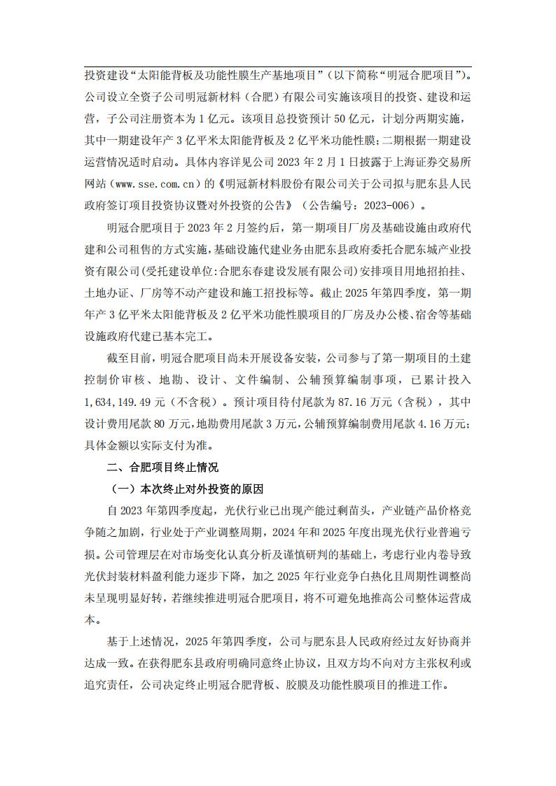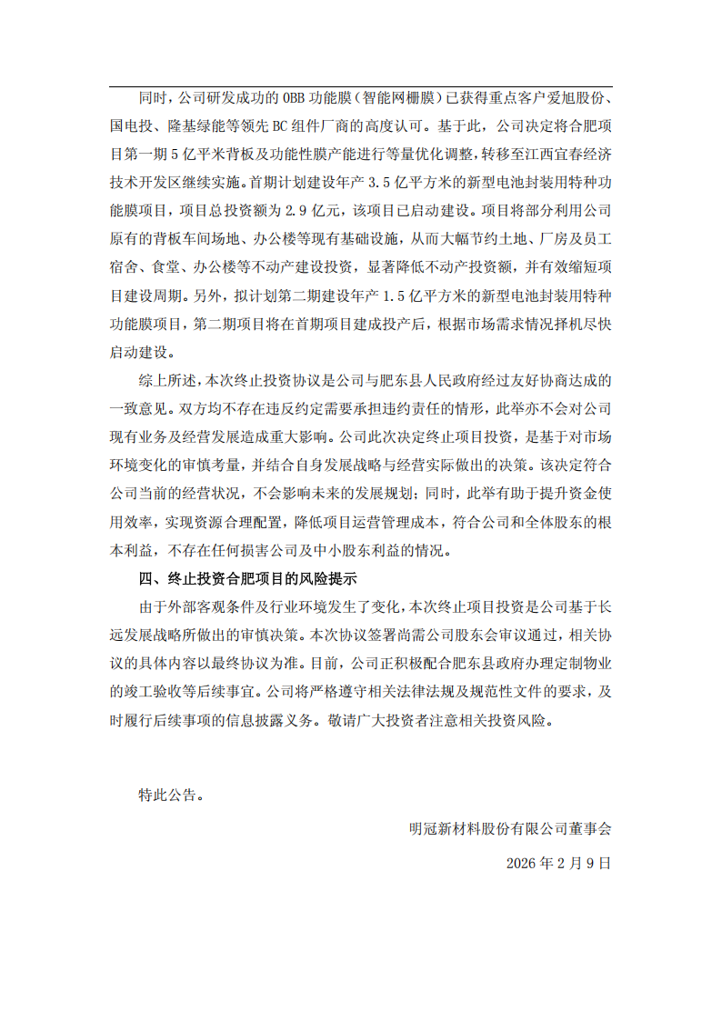 基于上述情况,2025 年第四季度,公司与肥东县人民政府经过友好协商并达成一致。在获得肥东县政府明确同意终止协议,且双方均不向对方主张权利或追究责任,公司决定终止明冠合肥背板、胶膜及功能性膜项目的推进工作。