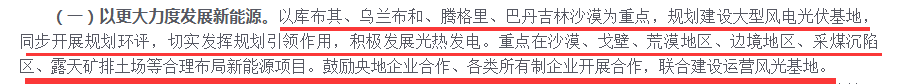 文件提出,以更大力度发展新能源。以库布其、乌兰布和、腾格里、巴丹吉林沙漠为重点,规划建设大型风电光伏基地,同步开展规划环评,切实发挥规划引领作用,积极发展光热发电。