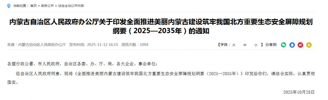 2025年11月,内蒙古自治区人民政府办公厅发布《关于印发全面推进美丽内蒙古建设筑牢我国北方重要生态安全屏障规划纲要(2025—2035年)的通知》。