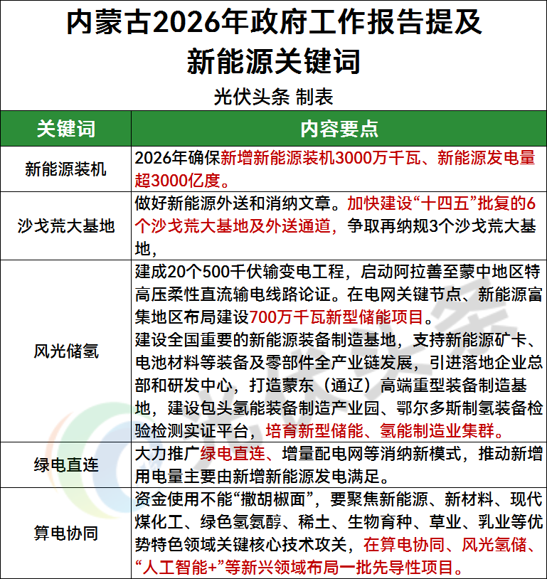 除了之前提到的2026年新能源装机新增目标,在政府工作报告中,内蒙古也提到了上述热词。