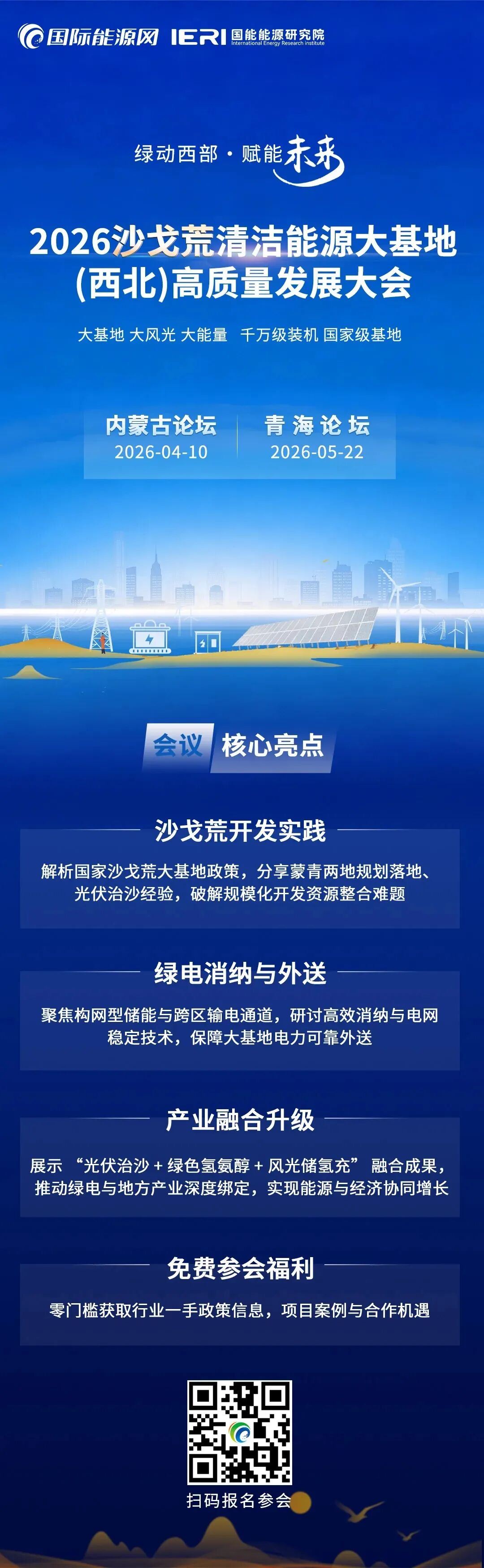 在此背景下,2026沙戈荒清洁能源大基地(西北)高质量发展大会,将于4月10日在呼和浩特盛大启幕!大会以“绿动西部·赋能未来”为核心主题,聚焦沙戈荒清洁能源布局、特高压外送通道建设、储能技术装备创新、生态保护与产业协同等核心议题,为行业各界搭建起深度研讨、资源对接、合作共赢的高端平台。