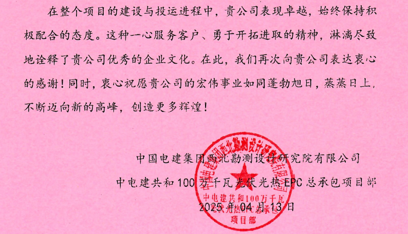 此次项目的高效完成更是让中电建对英利赞不绝口,连发两封感谢信给予高度赞誉:“英利团队展现出极强的责任意识和协作精神,自供货以来,精诚合作、共克时艰,顺利圆满完成组件交付、安装以及调试等一系列关键工作,为项目抢抓施工窗口期提供了关键支持。”