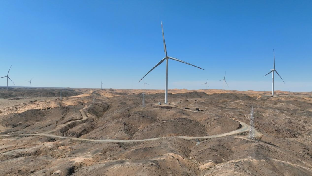 内蒙古公司上海庙至山东特高压外送通道阿拉善40万千瓦风电项目位于阿拉善左旗敖伦布拉格镇周边沙漠腹地,是国家“首批沙戈荒”风电基地项目,也是内蒙古公司在阿拉善地区投资建设的最大规模风电基地。该项目每年计划发电8.52亿千瓦时,通过特高压线路外送至山东地区消纳,为地区绿色能源平衡匹配、地方经济发展作出贡献。