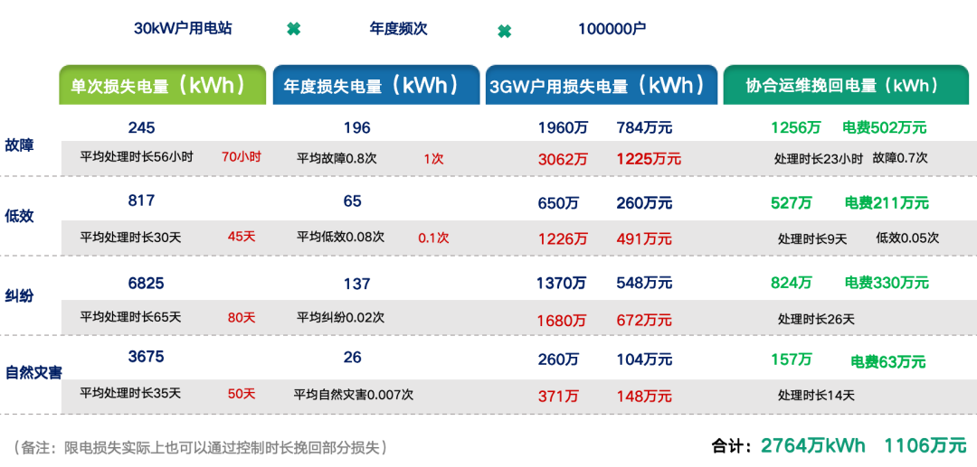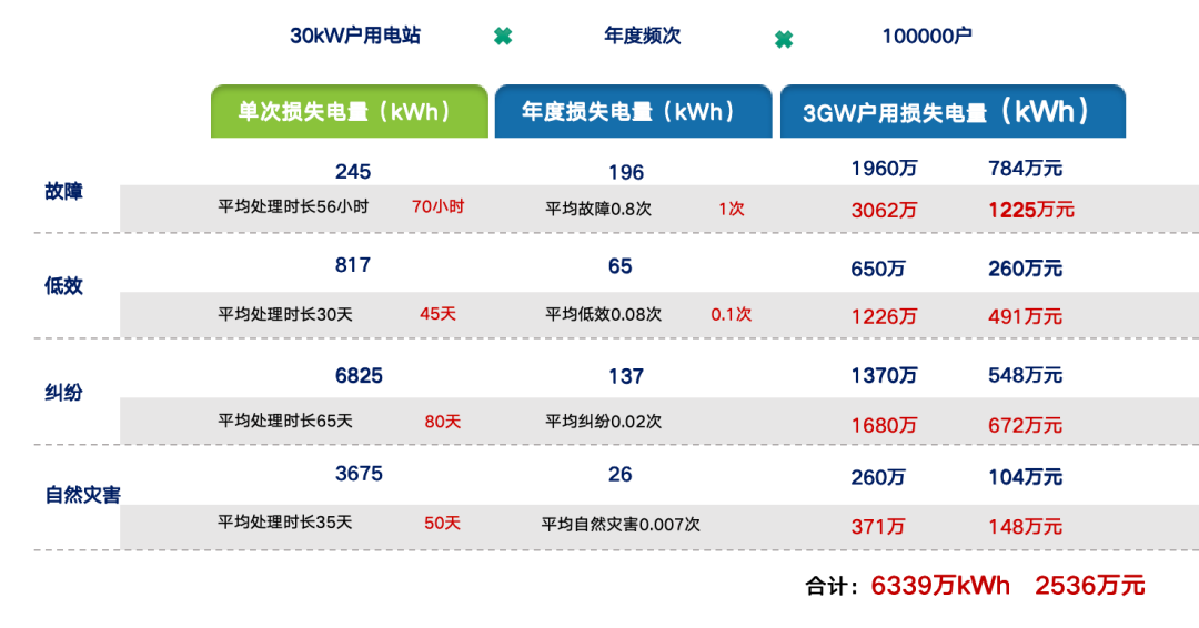 基于协合运维调研,1户30kW电站单次故障平均处理时长为56小时,单次损失电量约为245kWh;年度平均故障次数0.8次,年度损失电量约为196kWh。在此基础上,3GW户用电站的年度损失电量可达1960万kWh,损失电费高达784万元。