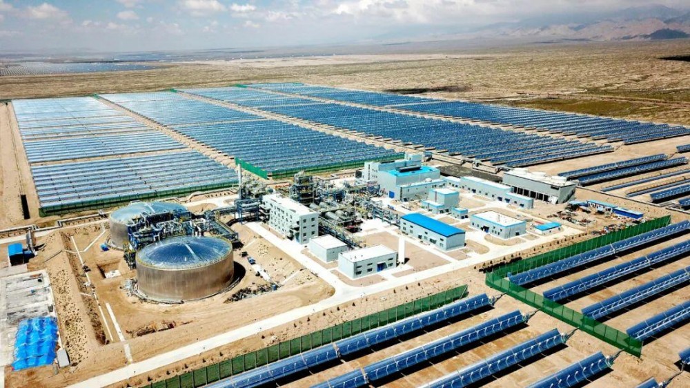 德令哈,蒙语意为“金色的世界”,地处青藏高原柴达木盆地,光照资源丰富,在太阳能热发电应用方面有着得天独厚的优势。中广核德令哈50兆瓦光热示范电站占地2.46平方公里,相当于360多个标准足球场的面积,采用了槽式导热油集热技术路线,配套9小时熔融盐储热,由太阳岛、热传及蒸汽发生系统、储热岛、发电岛四大部分组成。
