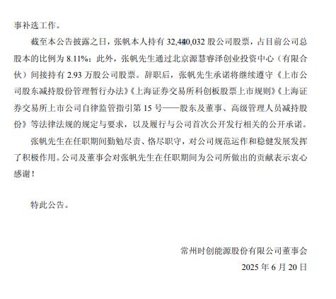 公告显示,时创能源于2025 年6 月19 日收到公司非独立董事张帆先生的辞职报告。因个人原因,张帆先生向董事会申请辞去公司第二届董事会非独立董事、第二届董事会薪酬与考核委员会委员职务。辞职后,张帆先生将不在公司担任任何职务。