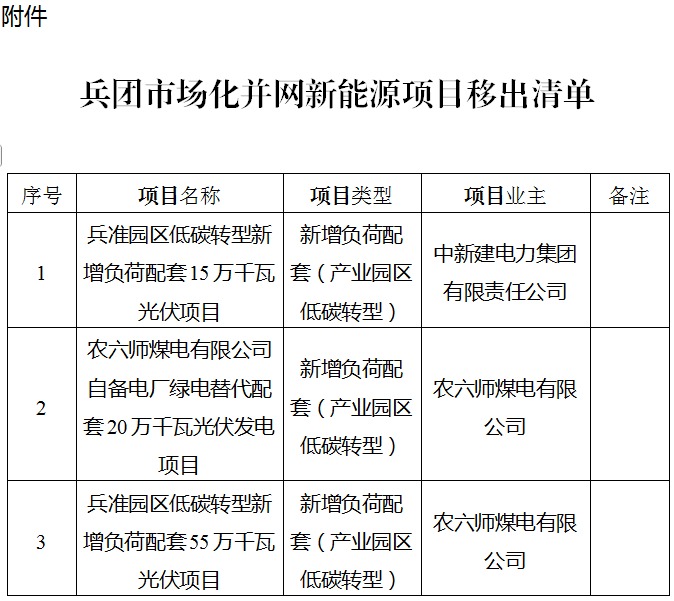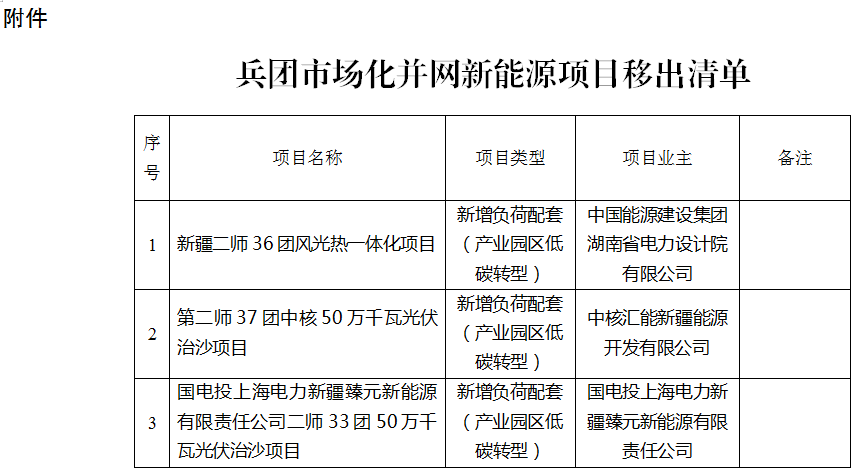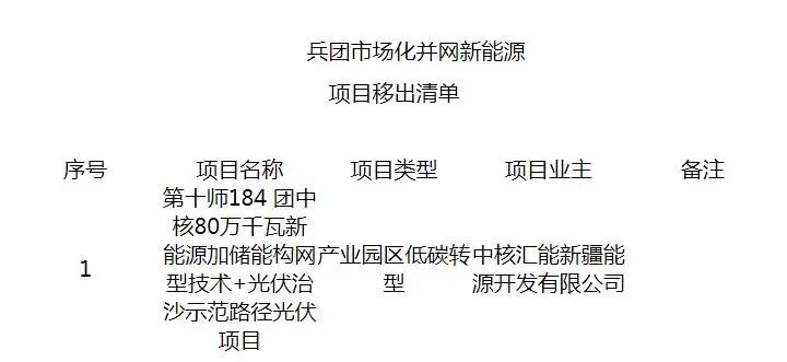 兵团市场化并网新能源项目移出清单