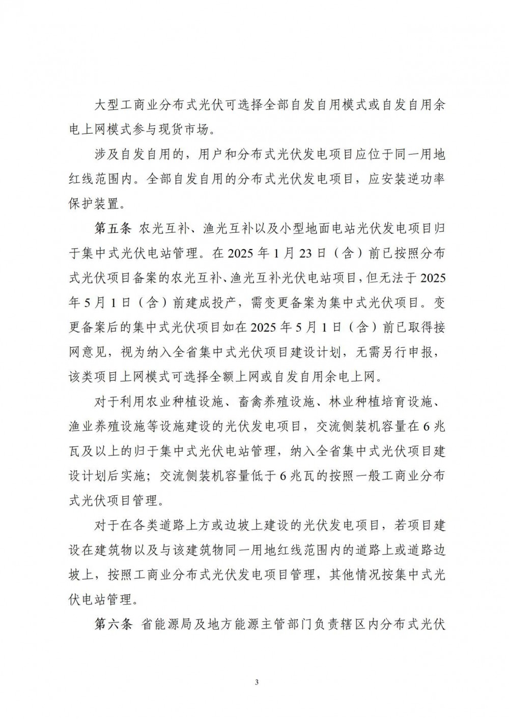 对于利用农业种植设施、畜禽养殖设施、林业种植培育设施、渔业养殖设施等设施建设的光伏发电项目,交流侧装机容量在6兆瓦及以上的归于集中式光伏电站管理,纳入全省集中式光伏项目建设计划后实施;交流侧装机容量低于6兆瓦的按照一般工商业分布式光伏项目管理。
