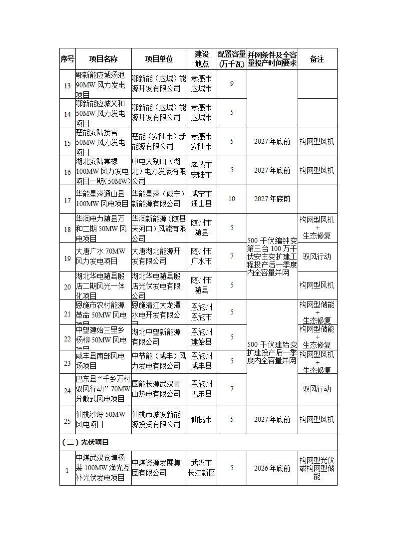 根据《省能源局关于开展2024年常规新能源发电项目竞争性配置的通知》(鄂能源新能〔2024〕61号)、《省能源局关于2024年度政策性配置新能源开发建设规模的通知》(鄂能源新能〔2024〕63号)和《省发改委 省能源局关于印发“千乡万村驭风行动”工作方案的通知》(鄂发改能源〔2024〕336号),现将第二批通过各级发改(能源)主管部门审核和国网湖北省电力有限公司接网校核的新能源发电项目予以公布。