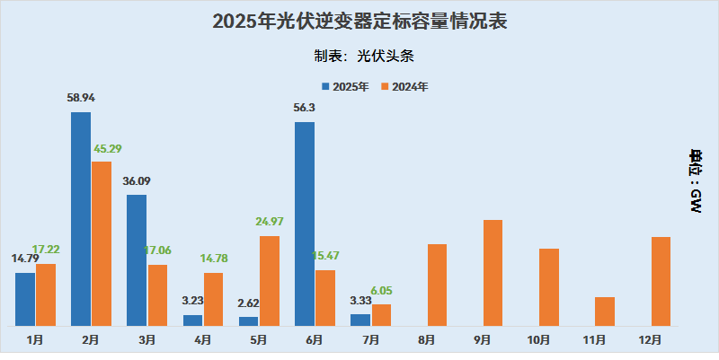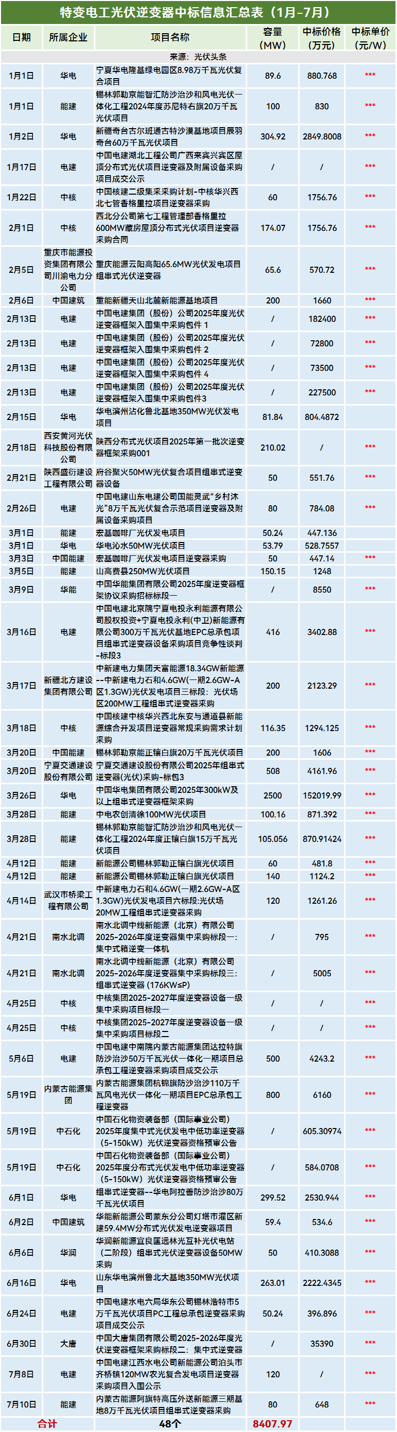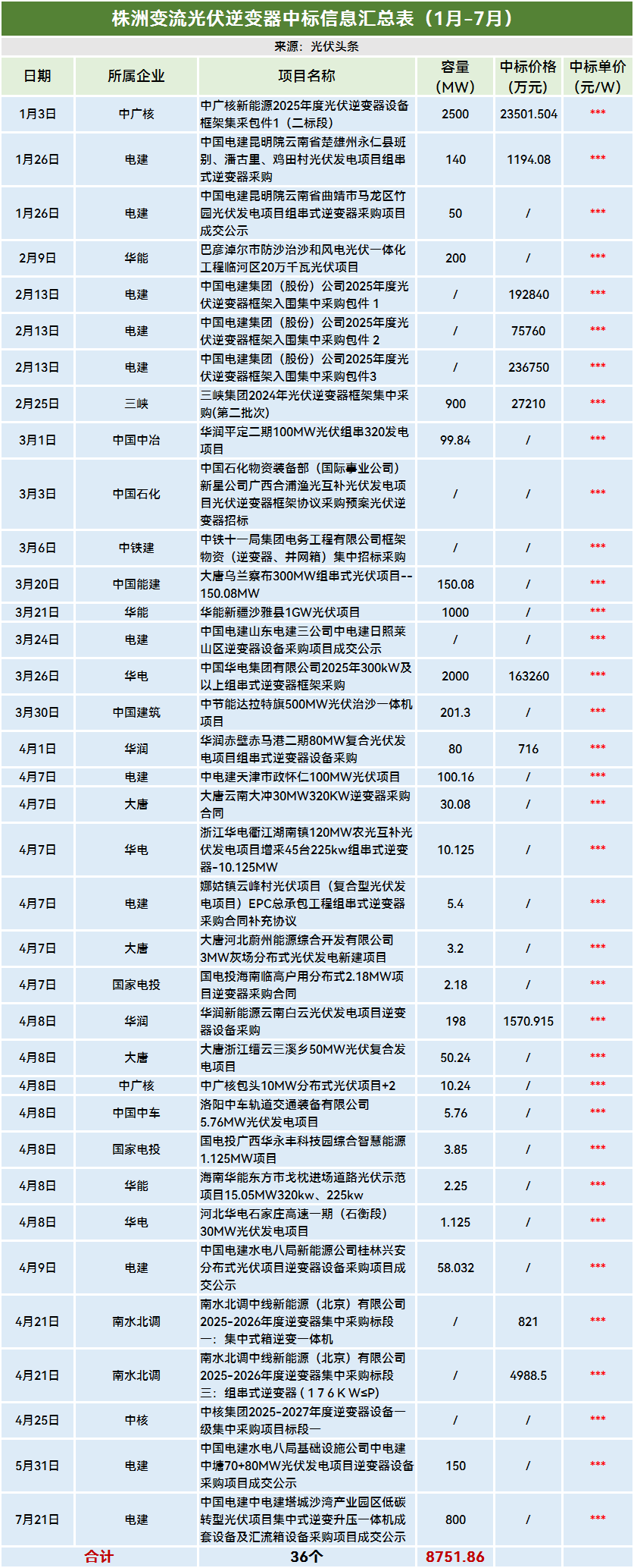 光伏头条根据公开信息统计,2025年1-7月,央国企约199个光伏逆变器招标项目,合计容量约68.82GW。