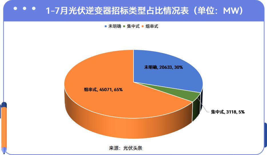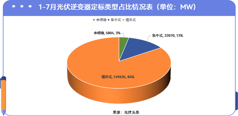 4、在技术路线上,1-7月定标的光伏逆变器项目之中,组串式逆变器合计容量149.64GW,占比达到84.3%。