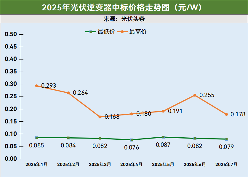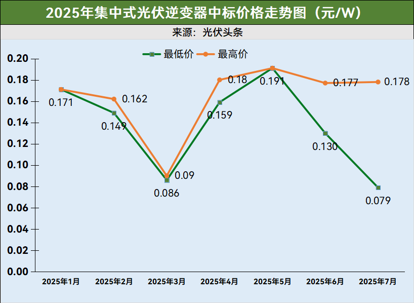 集中式逆变器最低价项目为江河机电济宁君阳电站2025年逆变器技术改造升级项目采购,项目为技改项目,采购5台500kW集中式逆变器,项目定标价之一为0.079元/W。