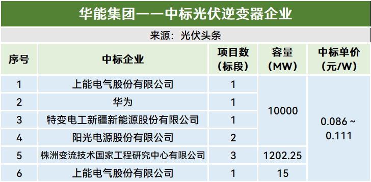 3月9日,中国华能集团有限公司2025年度逆变器框架协议采购项目定标,两个标段合计容量10GW。