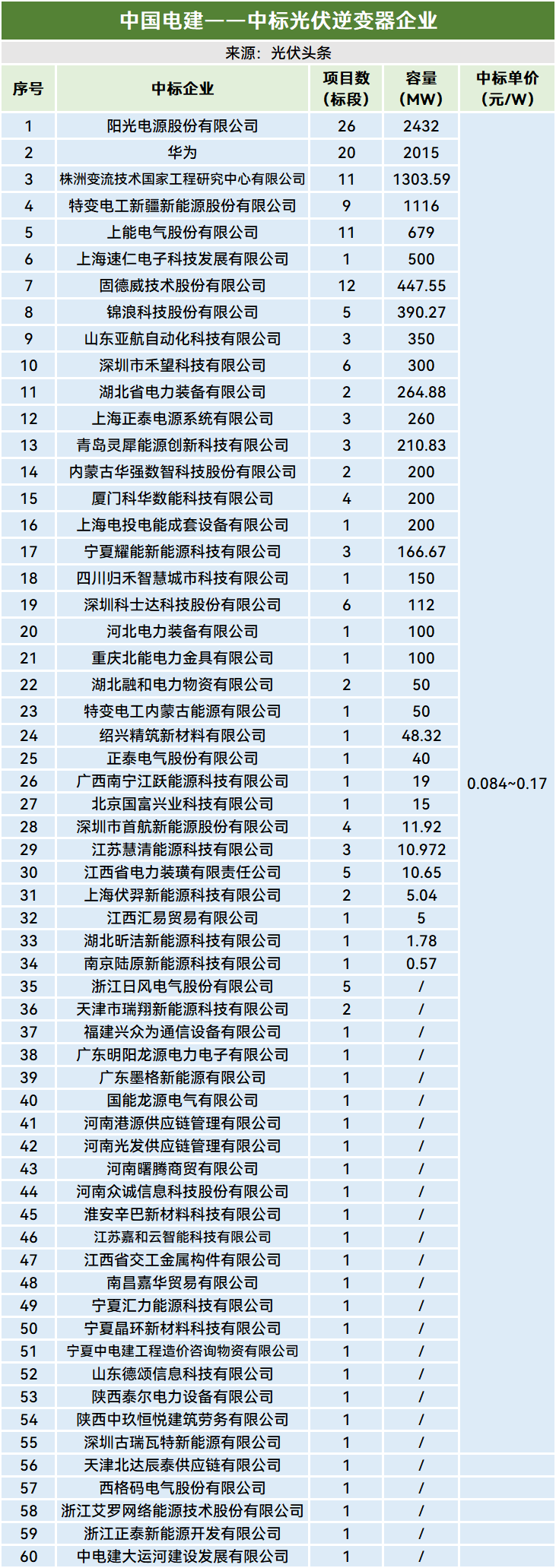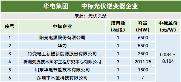 5、中标企业方面,华为、阳光电源、株洲变流、特变电工、上能电气、华电节能、双杰电气、正泰电源、锦浪科技、固德威等155家企业中标。