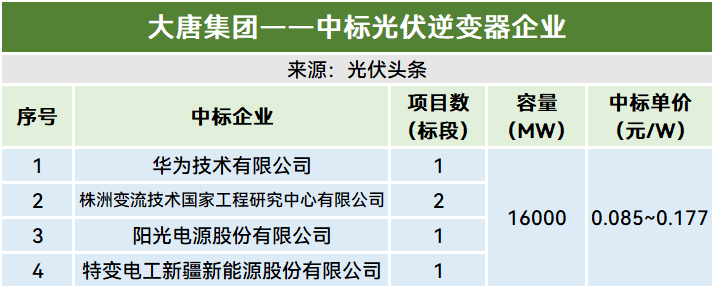 中国大唐集团有限公司2025-2026年度光伏逆变器框架采购项目定标,两个标段合计容量16GW。华为、株洲变流、、阳光电源、特变电工4家企业成为最大赢家。