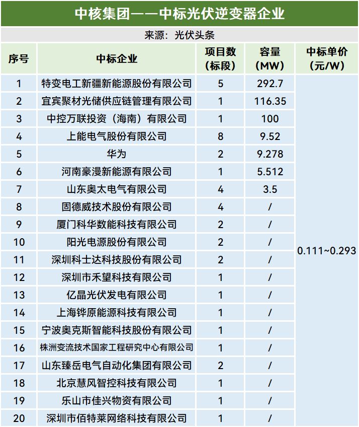 中核集团有30个项目定标,合计容量39.43GW。特变电工、上能电气、华为、固德威、科华数能、阳光电源、科士达、株洲变流等18家企业成为最大赢家。