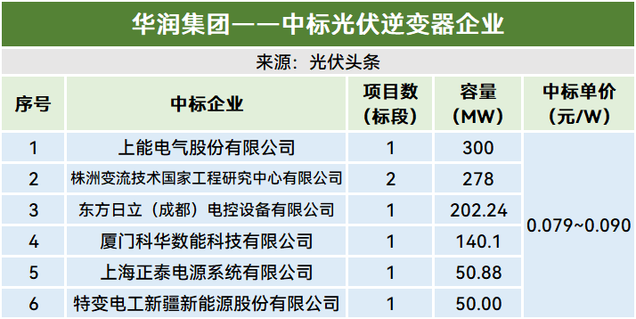 华润集团有7个项目定标,合计容量1021.22MW。上能电气、株洲变流、东方日立、科华数能、正泰电源、特变电工等6家逆变器企业中标。