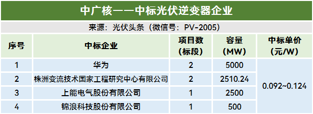 1月3日,中广核新能源2025年度光伏逆变器设备框架集采项目公示中标人。华为、上能电气、株洲变流、锦浪科技等4家企业成为最大赢家,合计赢得10.5GW订单。