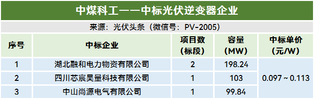 中煤科工有4个项目定标,合计容量401.08MW。中标详情如下:
