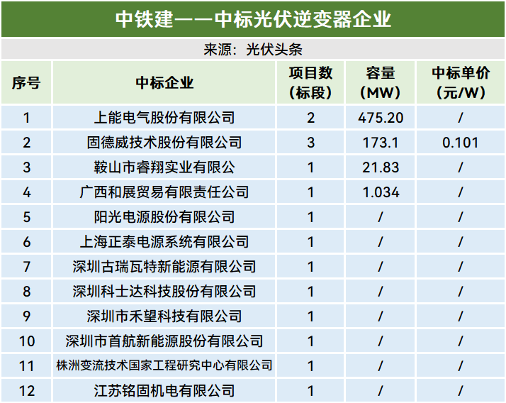 本统计周期,中铁建有16个项目定标,合计容量672.37MW。上能电气、固德威、阳光电源、正泰电源、古瑞瓦特、科士达、禾望电气、首航新能、株洲变流等11家企业中标。