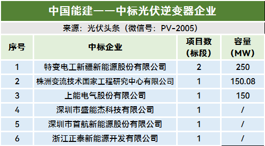 中国能建有7个项目定标,合计容量550.08MW。特变电工、上能电气、盛能杰、首航新能、正泰电源等5家逆变器企业中标。