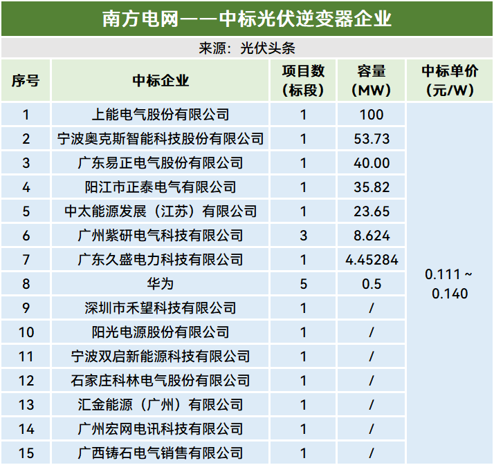 南方电网有160个项目定标,合计容量266.77MW。上能电气、华为、禾望电气、阳光电源、科林电气等14家逆变器企业中标。