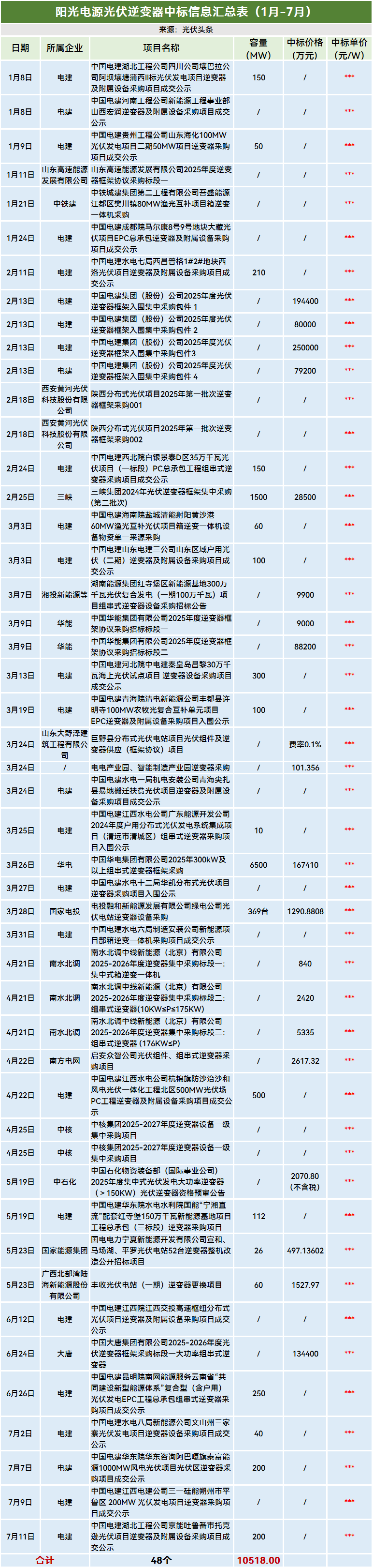 1月3日,中广核新能源发布2025年度光伏逆变器设备框架集采中标公示,采购容量高达10.5GW。