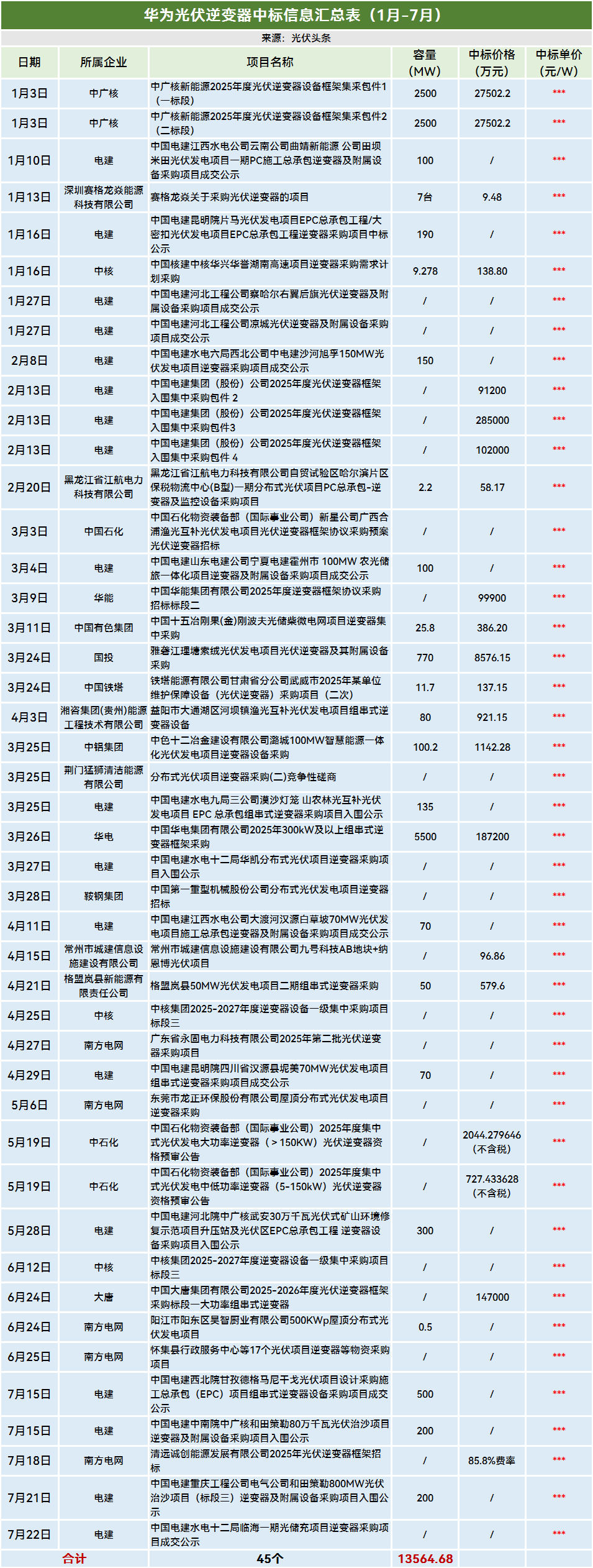 光伏头条根据公开信息统计,华为1-7月,光伏逆变器中标均价为0.131元/W。