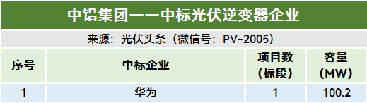 3月25日,中铝集团中色十二冶金建设有限公司潞城100MW智慧能源一体化光伏发电项目逆变器设备采购公示中标人,华为成为最终赢家。