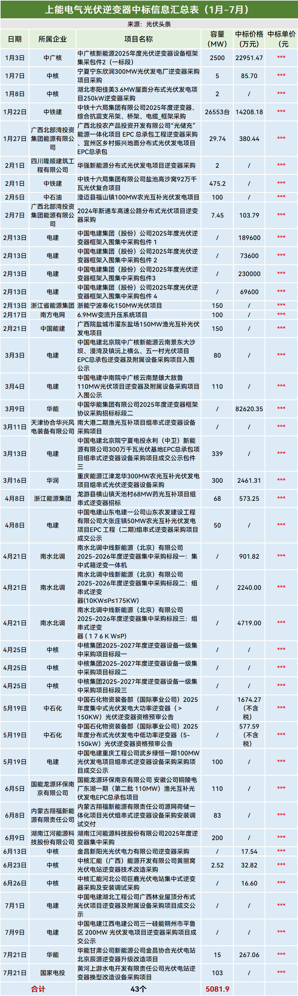 本统计周期,上能电气位列中标榜第三名,中标中广核、中核、中铁建、中石油、电建、南方电网、中国能建、华能、华润、南水北调、中石化、国家电投等企业43个项目(标段),确定中标容量5081.9MW。