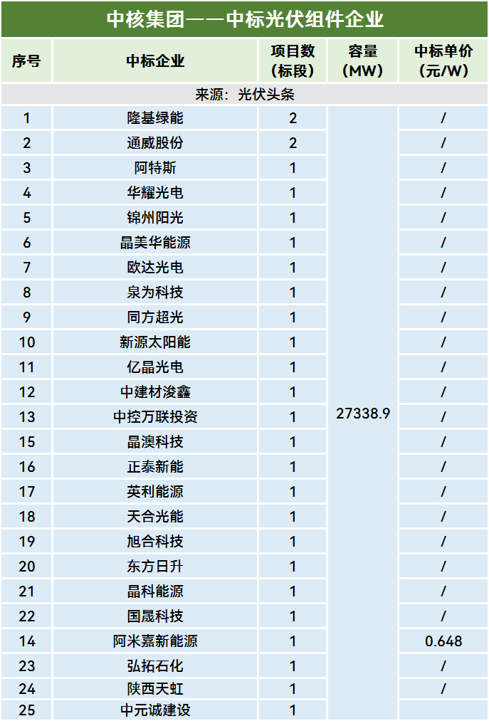 其中,6月,中核集团2025-2026年度光伏组件设备一级集中采购项目中标结果公示。晶澳科技、隆基绿能、正泰新能、英利发展、天合光能、通威股份、旭合科技、东方日升、晶科能源、国晟新能10家光伏组件企业中标。
