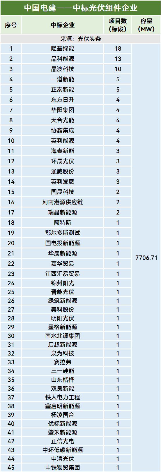 中国电建在本统计周期共有115个项目(标段)定标,规模共计7.7GW,隆基绿能、晶科能源、晶澳科技、一道新能、正泰新能、东方日升、华阳集团、天合光能、协鑫集成、英利能源、海泰新能、环晟光伏、通威股份、英利发展等45个企业中标。