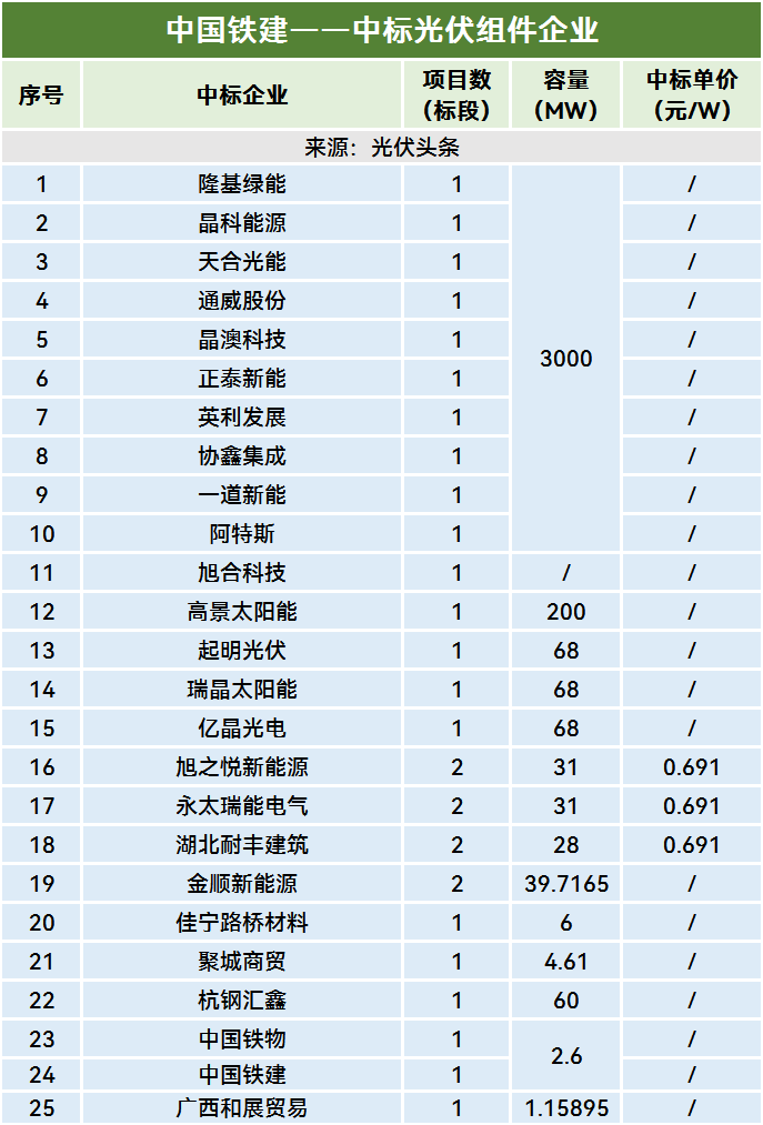 中国铁建在本统计周期共有21个项目(标段)定标,规模共计3.6GW,隆基绿能、晶科能源、天合光能、通威股份、晶澳科技、正泰新能、英利发展、协鑫集成、一道新能、阿特斯、旭合科技、高景太阳能等中标。